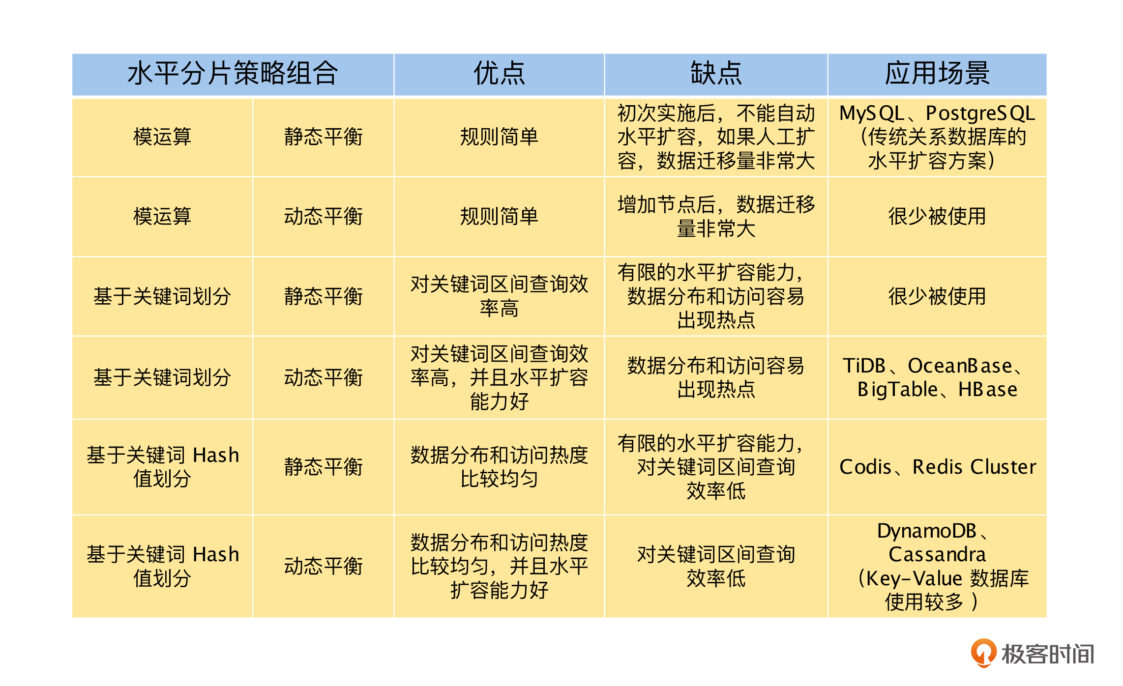 了解了水平分片的两个维度,数据划分策略和数据平衡策略后,我们将常见的数据划分策略和动态、静态的数据平衡策略交叉组合,一一来讨论它们的优缺点和应用场景,具体如下表。