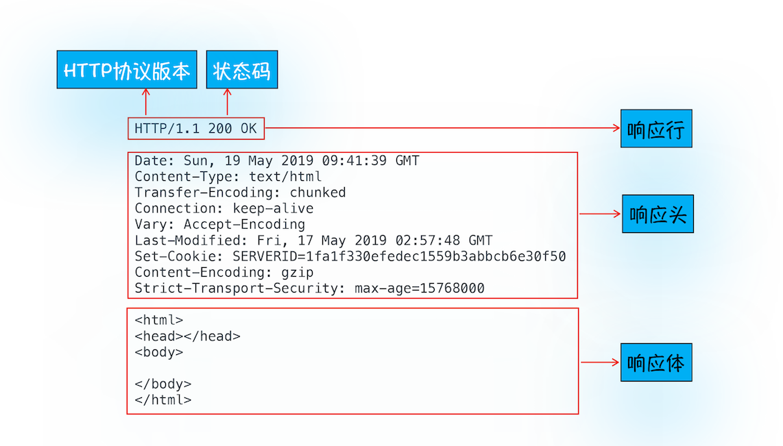 随后,正如浏览器会随同请求发送请求头一样,服务器也会随同响应向浏览器发送响应头。响应头包含了服务器自身的一些信息,比如服务器生成返回数据的时间、返回的数据类型(JSON、HTML、流媒体等类型),以及服务器要在客户端保存的Cookie等信息。