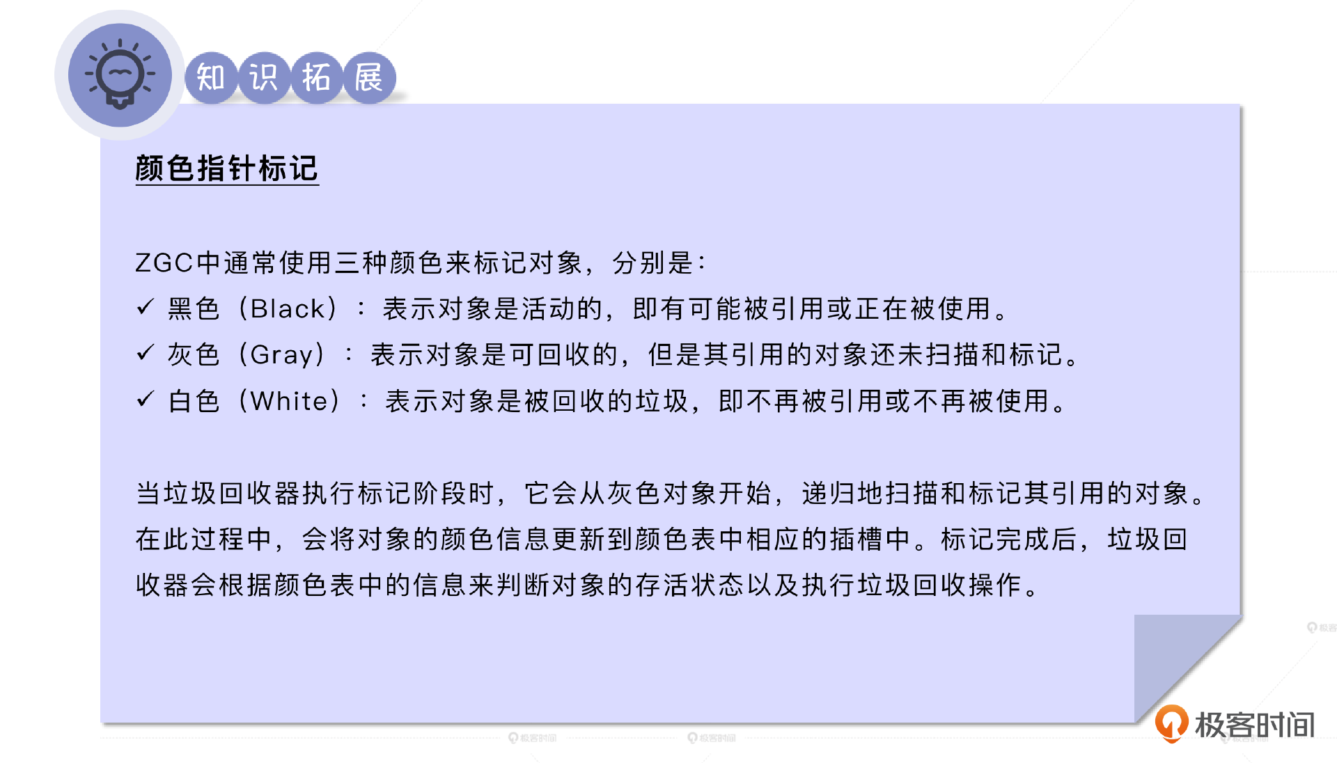 此外,ZGC还引入了一种叫做颜色指针的技术,来提高垃圾回收器的效率,降低停顿时间。在并发标记阶段,颜色指针可以帮助垃圾回收器判断对象是否已经被标记为活动或非活动状态,从而避免在并发标记过程中使用读屏障捕获引用关系的变化,降低垃圾回收的开销和停顿时间。简单来说,在垃圾收集期间,如果一个对象被颜色指针标记为“黑色”,那就表示它是活动的,否则就是非活动的。通过这种方式,颜色指针在不侵入传统垃圾收集的基础上提高了垃圾收集的效率和降低了停顿时间。