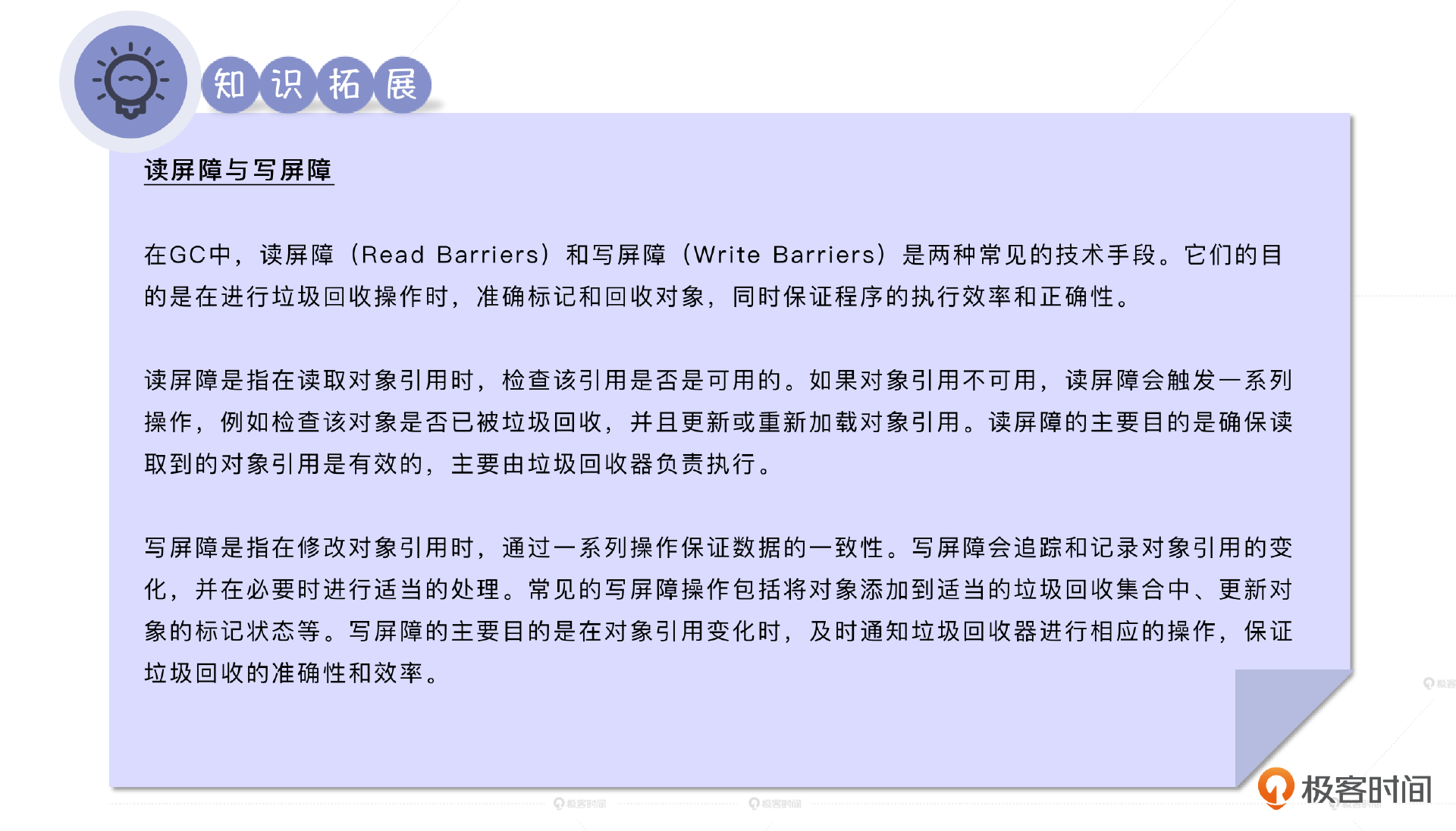 与此同时,ZGC比起其他的垃圾回收器,比如G1或者CMS,它有一个巨大的优势:它可以一边让顾客继续购物(程序运行)一边做清理和整理工作。也就是说,你的顾客(程序)根本感觉不到背后正在进行的清理工作,他们可以无阻碍地继续购物(程序运行)。之所以能实现这种效果,是因为相比于G1 采用写屏障的方式,ZGC采用的是读屏障的方式。
