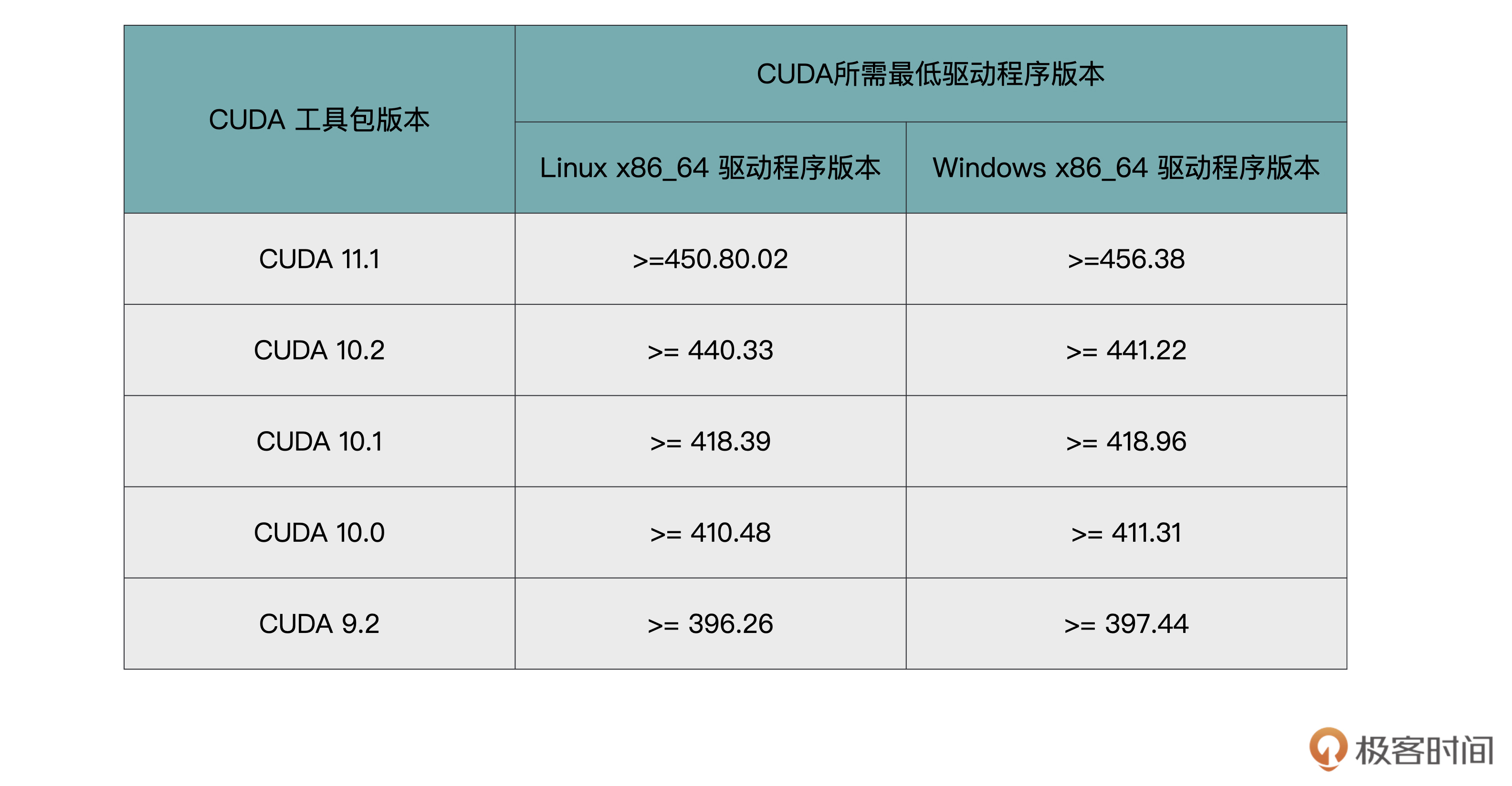 我用表格的方式,帮你梳理了CUDA版本与GPU驱动版本的对应关系,你可以根据自己计算机驱动的情况对照查看。例如,CUDA 11.1支持的 Linux驱动程序是450.80.02以上。