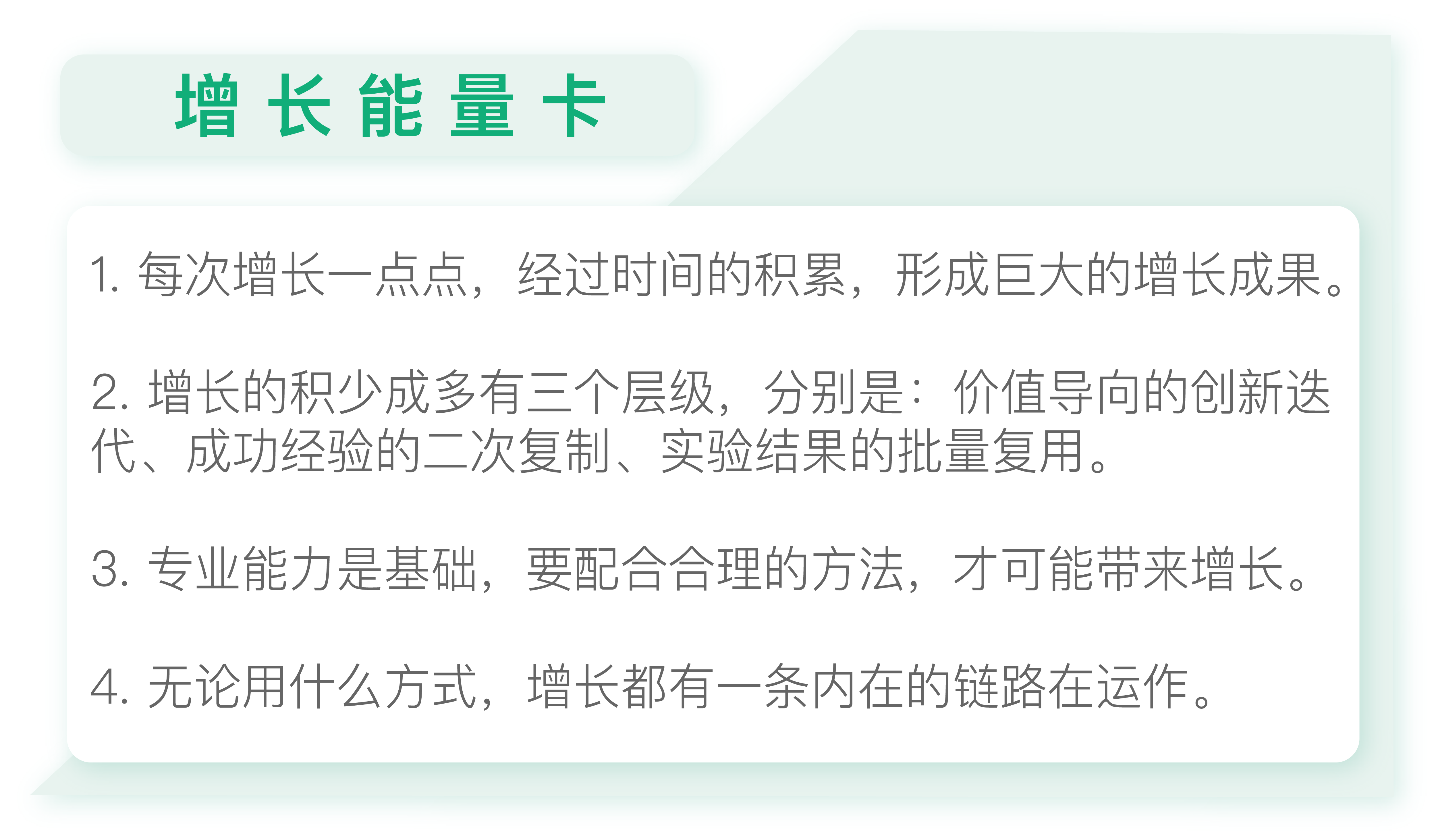 增长也是这样,如果你养成了科学实验的习惯,每次增长一点点,坚持一段时间,就会积累出巨大的成果。