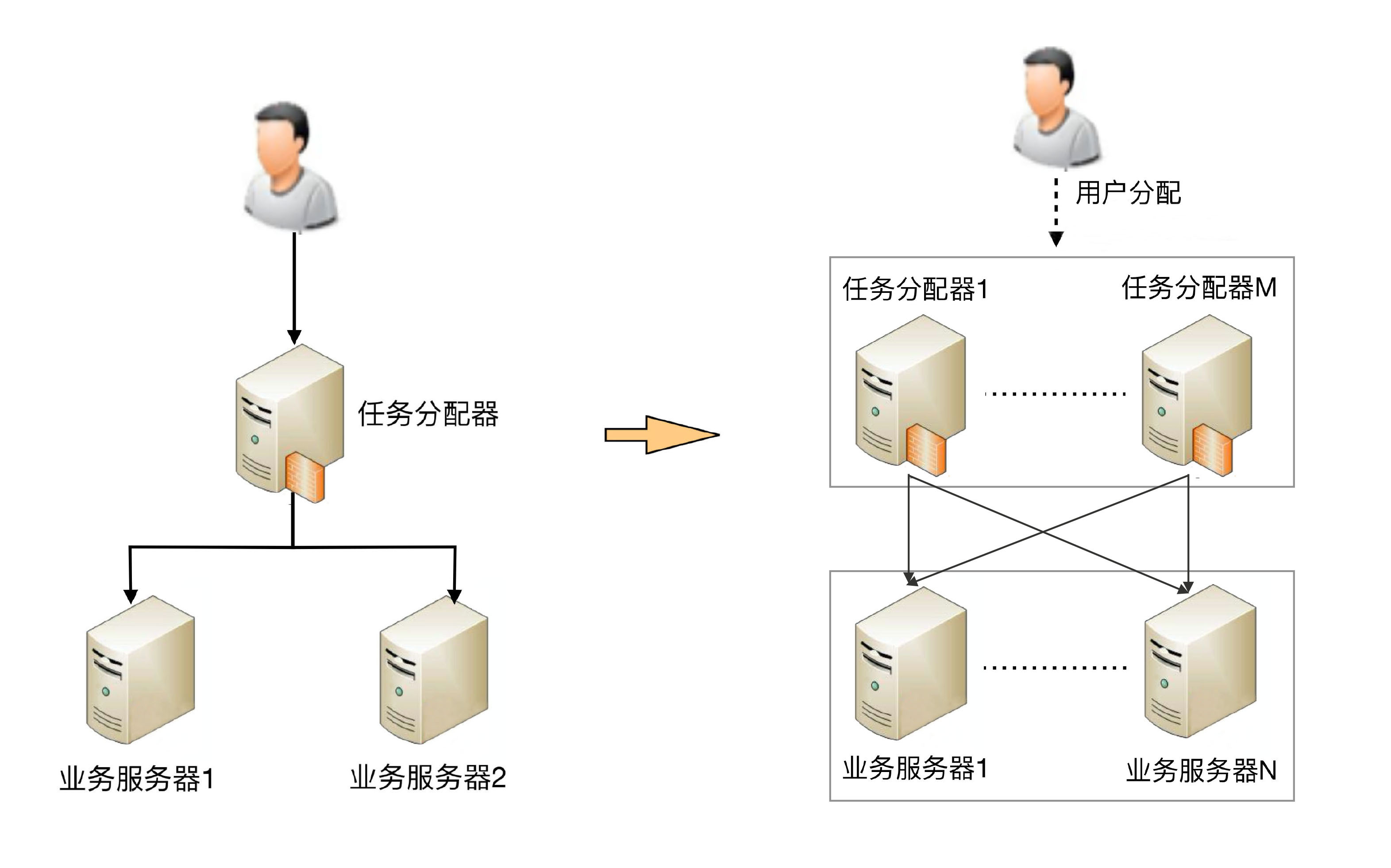 - 任务分配器和业务服务器的连接从简单的“1对多”(1台任务分配器连接多台业务服务器)变成了“多对多”(多台任务分配器连接多台业务服务器)的网状结构。