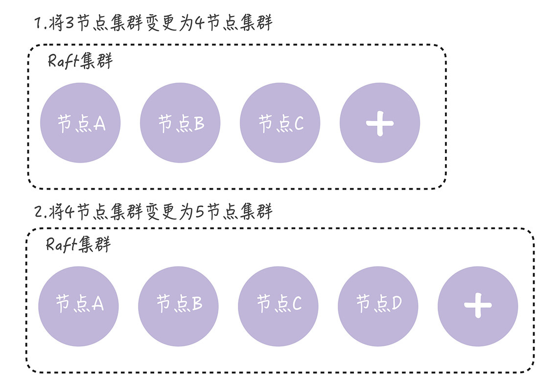 单节点变更,就是通过一次变更一个节点实现成员变更。如果需要变更多个节点,那你需要执行多次单节点变更。比如将3节点集群扩容为5节点集群,这时你需要执行2次单节点变更,先将3节点集群变更为4节点集群,然后再将4节点集群变更为5节点集群,就像下图的样子。