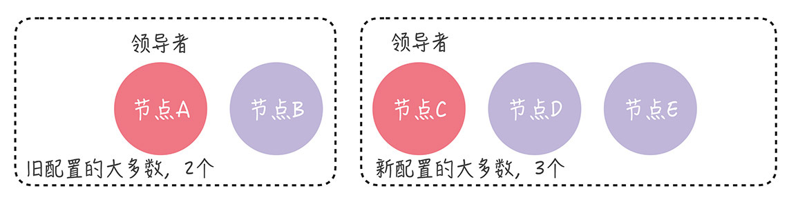 需要你注意的是,在分区错误、节点故障等情况下,如果我们并发执行单节点变更,那么就可能出现一次单节点变更尚未完成,新的单节点变更又在执行,导致集群出现2个领导者的情况。