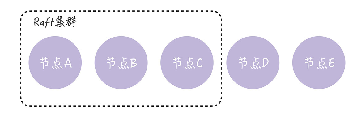 假设我们有一个由节点A、B、C组成的Raft集群,现在我们需要增加数据副本数,增加2个副本(也就是增加2台服务器),扩展为由节点A、B、C、D、E, 5个节点组成的新集群: