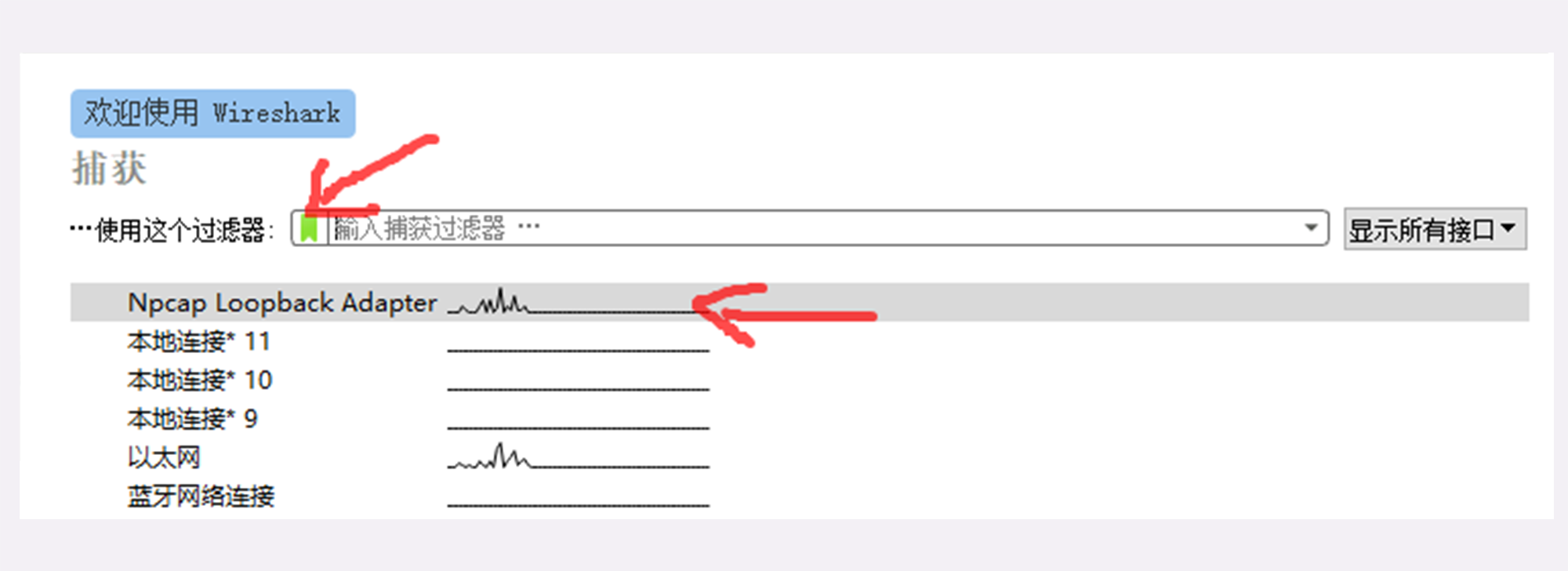 因为我们的实验环境运行在本机的127.0.0.1上,也就是loopback“环回”地址。所以,在Wireshark里要选择“Npcap loopback Adapter”,过滤器选择“HTTP TCP port(80)”,即只抓取HTTP相关的数据包。鼠标双击开始界面里的“Npcap loopback Adapter”即可开始抓取本机上的网络数据。