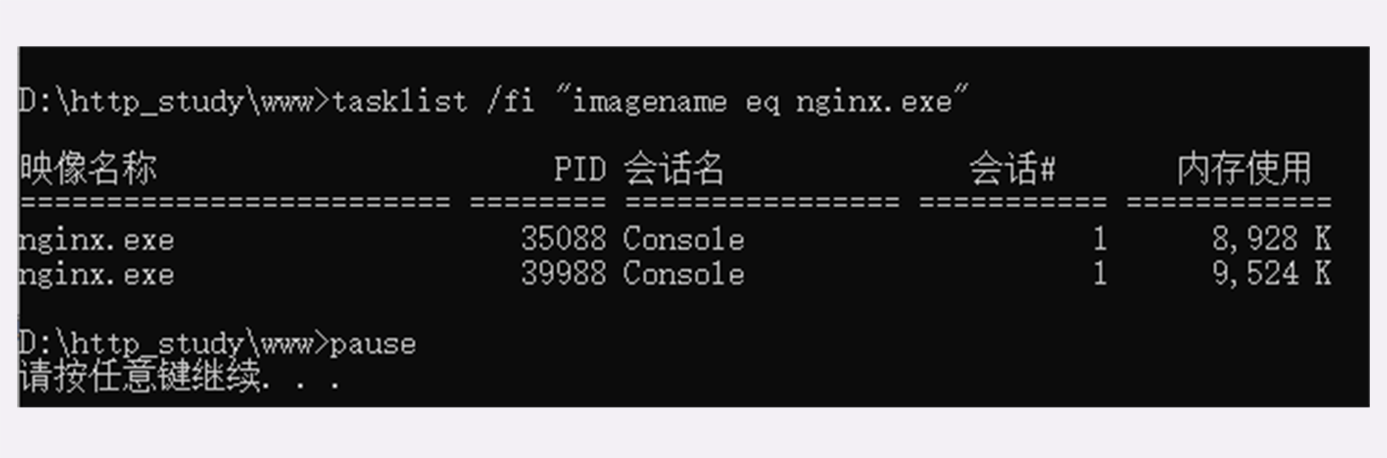 运行后,鼠标双击“list”可以查看OpenResty是否已经正常启动,应该会有两个nginx.exe的后台进程,大概是下图的样子。
