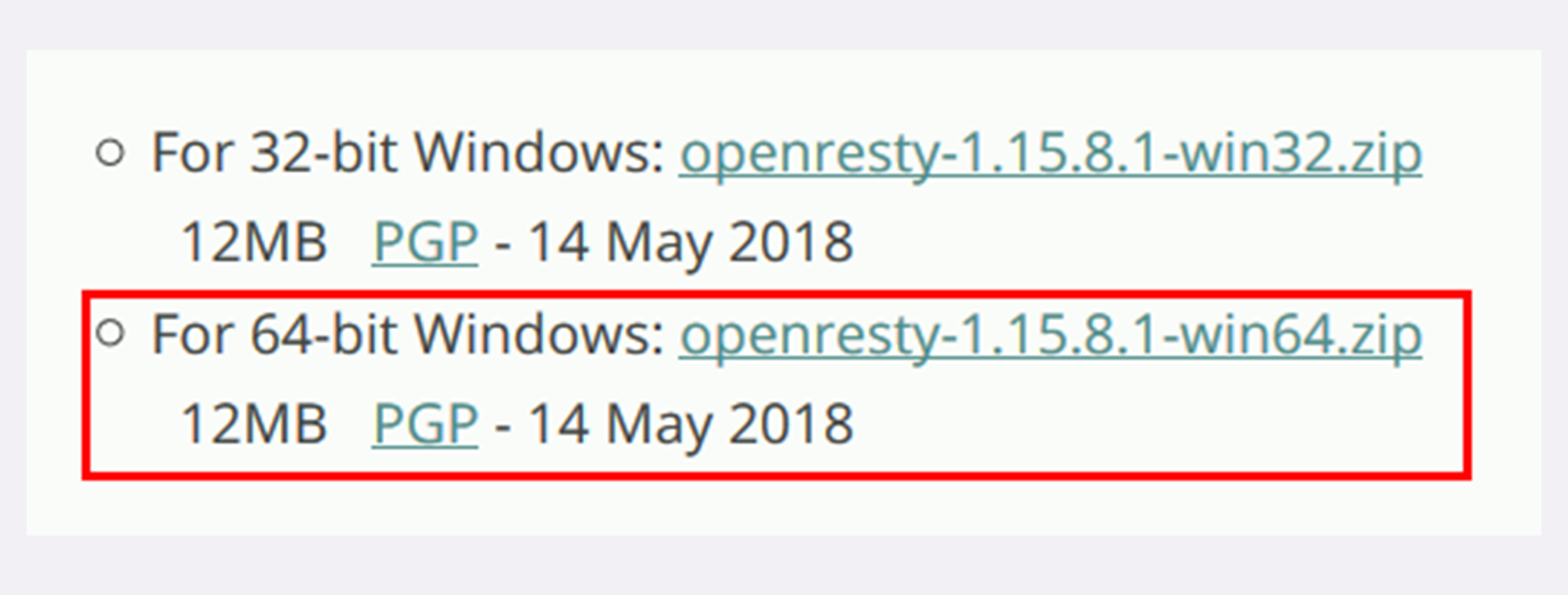 接下来我们要安装OpenResty,去它的官网,点击左边栏的“Download”,进入下载页面,下载适合你系统的版本(这里我下载的是64位的1.15.8.1,包的名字是“openresty-1.15.8.1-win64.zip”)。