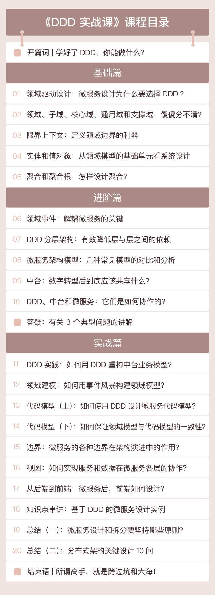 进阶篇主要讲解领域事件、DDD分层架构、几种常见的微服务架构模型以及中台设计思想等内容。具体包括: