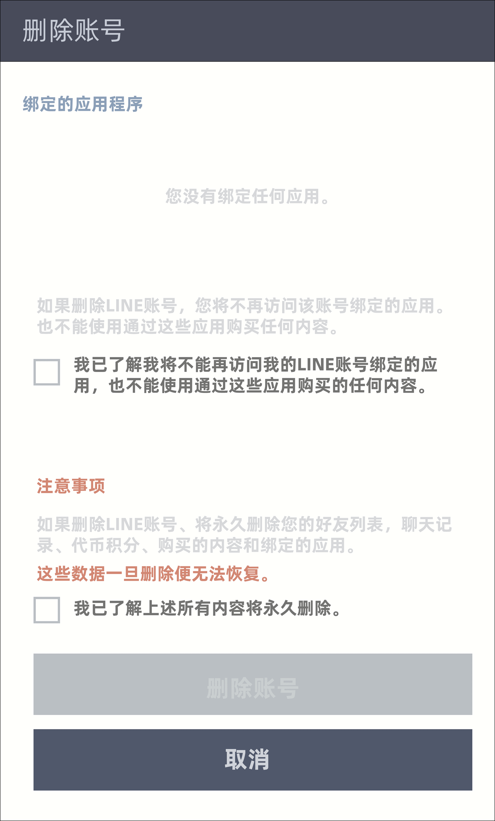 Line这款聊天软件提供了彻底的账号删除功能,并详细阐述了删除后的后果。参见下图: