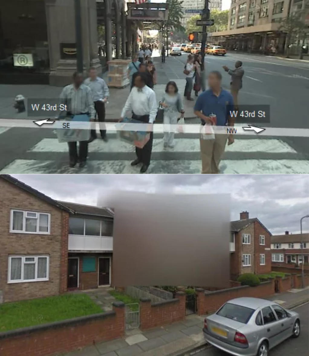 Google Map的街景模糊处理技术也是一个非常棒的设计。不仅在StreetView 3D街景展示中能自动模糊人脸和车牌,而且还设计了一个隐私申报的接口,如果用户申报,甚至可以对整个房屋、车体、甚至身体做模糊处理。