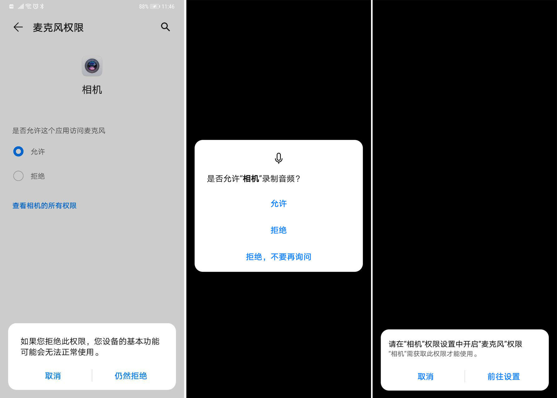 如果我们以允许反悔的标准来看,下面这个例子并不是一个好的设计。在相机里面,麦克风被强制定义为一个基本权限,如果被取消,相机应用完全打不开。
