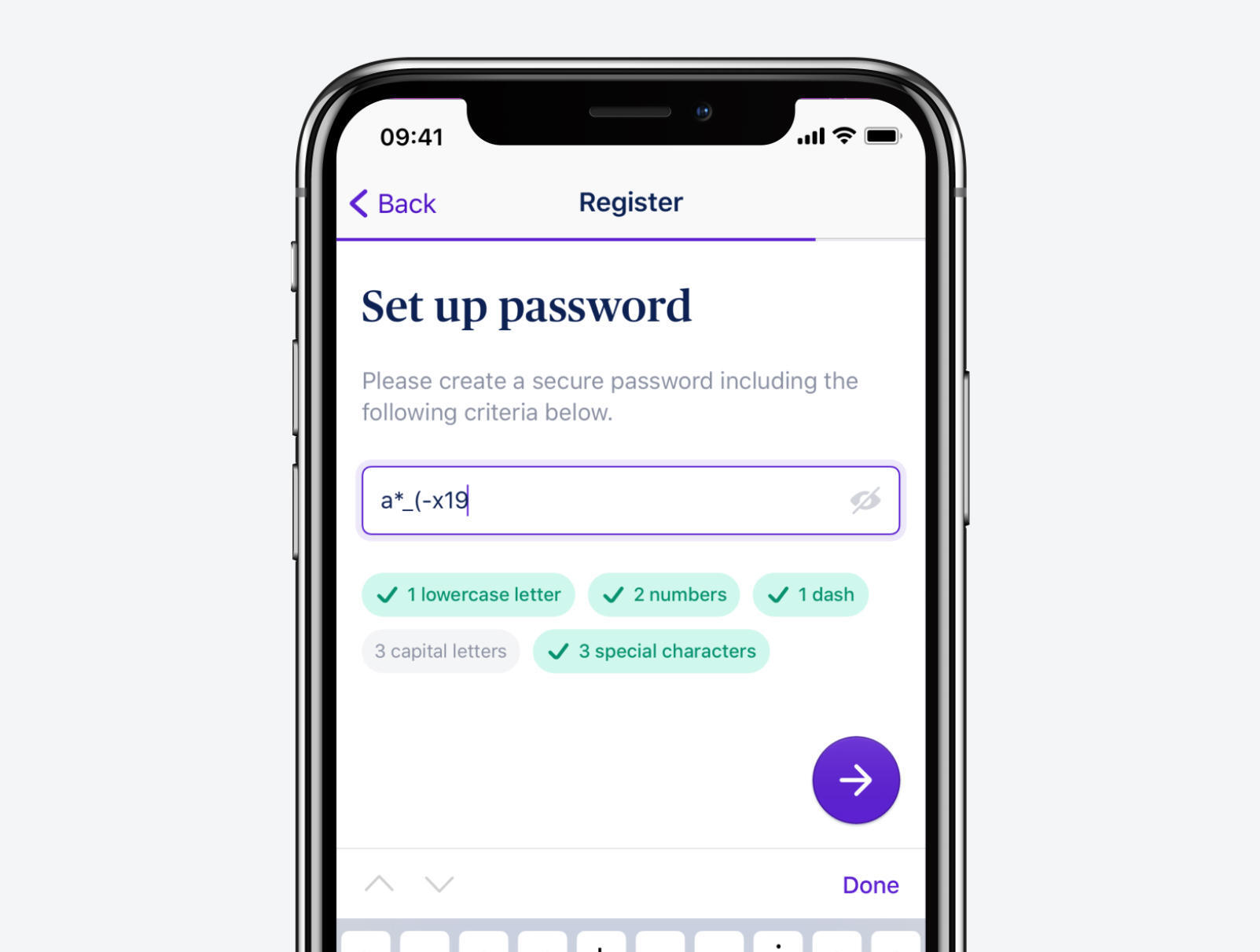 - 如果你希望用户输入密码的复杂度提升,请给予进一步清晰的输入建议。比如下面的密码输入,清晰给出了必须同时有大写和小写字母、必须包含特殊字符、必须含数字等等。而且只有用户输入达到要求后,对应的条件才会挑勾变色,来引导用户输入符合要求的密码。