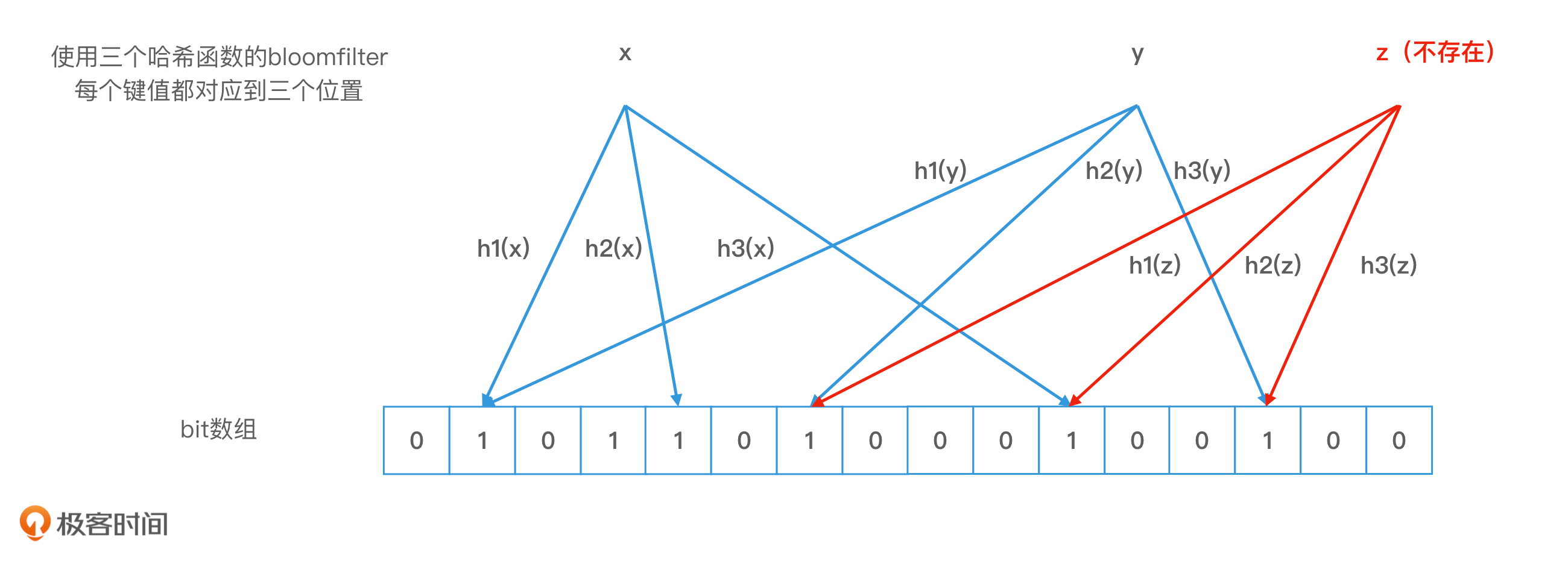 我在下图给出了一个例子。我们可以看到,布隆过滤器中存储了x和y两个对象,它们对应的bit位被置为1。当我们查询一个不存在的对象z时,如果z的k个哈希值的对应位置的值正好都是1,z就会被错误地认定为存在。而且,这个时候,z和x,以及z和y,两两之间也并没有发生哈希冲突。