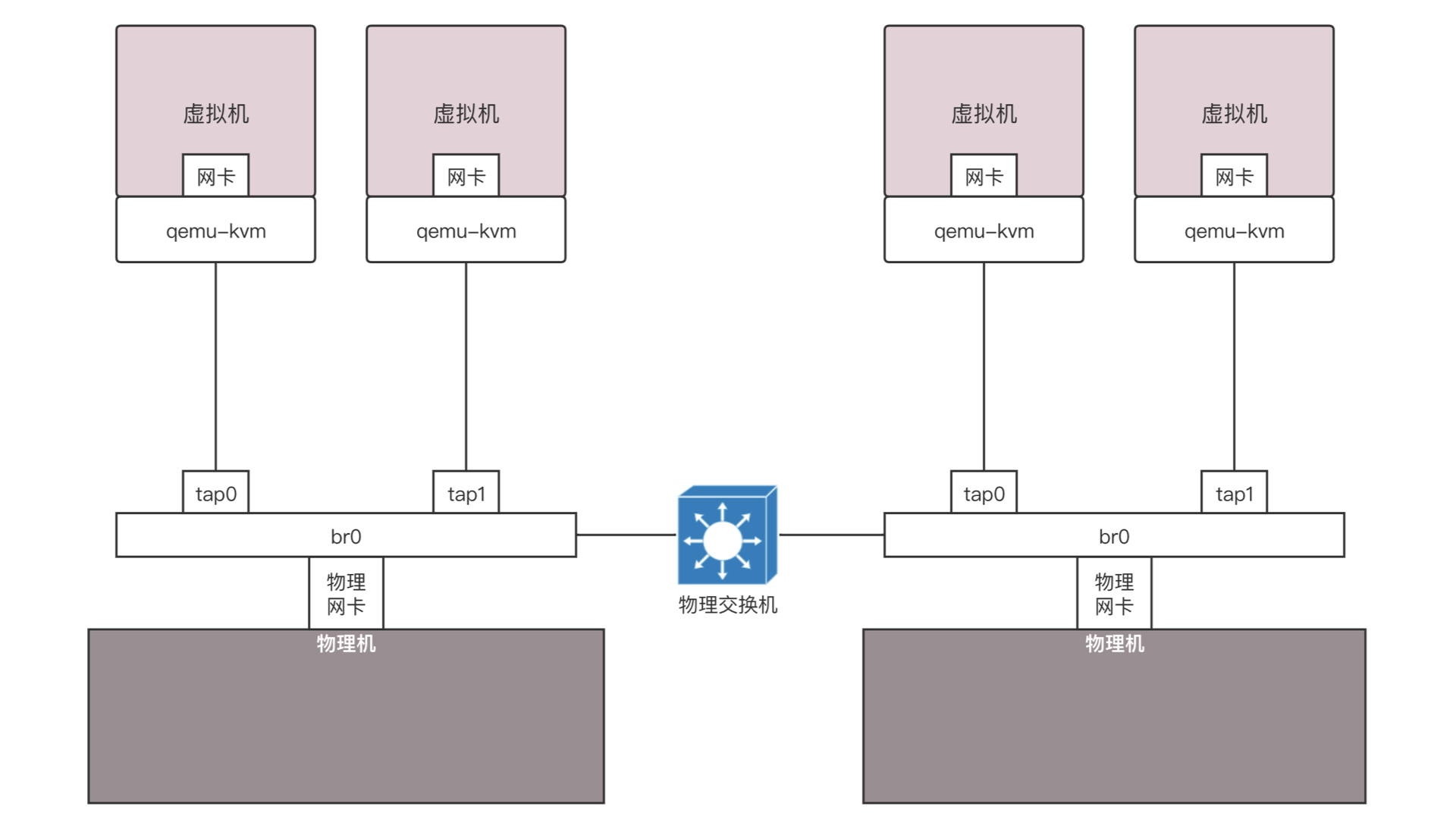 如果是你自己登录到物理机上做个简单配置,你可以简化一下。例如将虚拟机所在网络的网关的地址直接配置到br0上,不用DHCP Server,手动配置每台虚拟机的IP地址,通过命令iptables -t nat -A POSTROUTING -o ethX -j MASQUERADE,直接在物理网卡ethX上进行NAT,所有从这个网卡出去的包都NAT成这个网卡的地址。通过设置net.ipv4.ip_forward = 1,开启物理机的转发功能,直接做路由器,而不用单独的路由器,这样虚拟机就能直接上网了。
