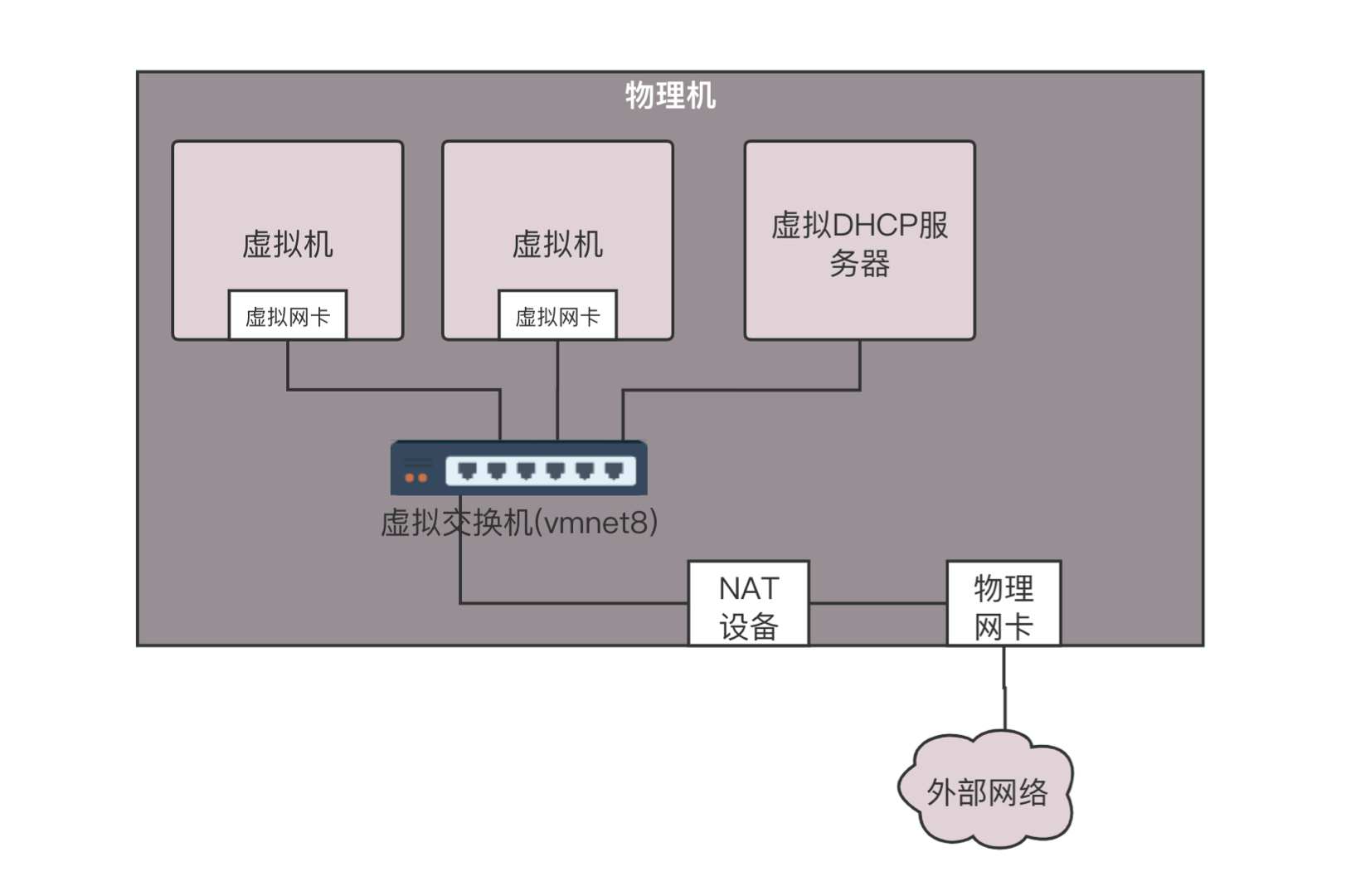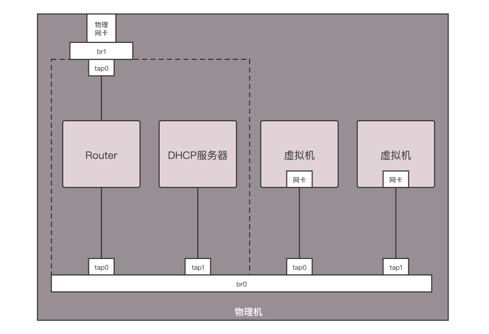 虚拟机是你的电脑,路由器和DHCP Server相当于家用路由器或者寝室长的电脑,物理网卡相当于你们宿舍的外网网口,用于访问互联网。所有电脑都通过内网网口连接到一个网桥br0上,虚拟机要想访问互联网,需要通过br0连到路由器上,然后通过路由器将请求NAT成为物理网络的地址,转发到物理网络。