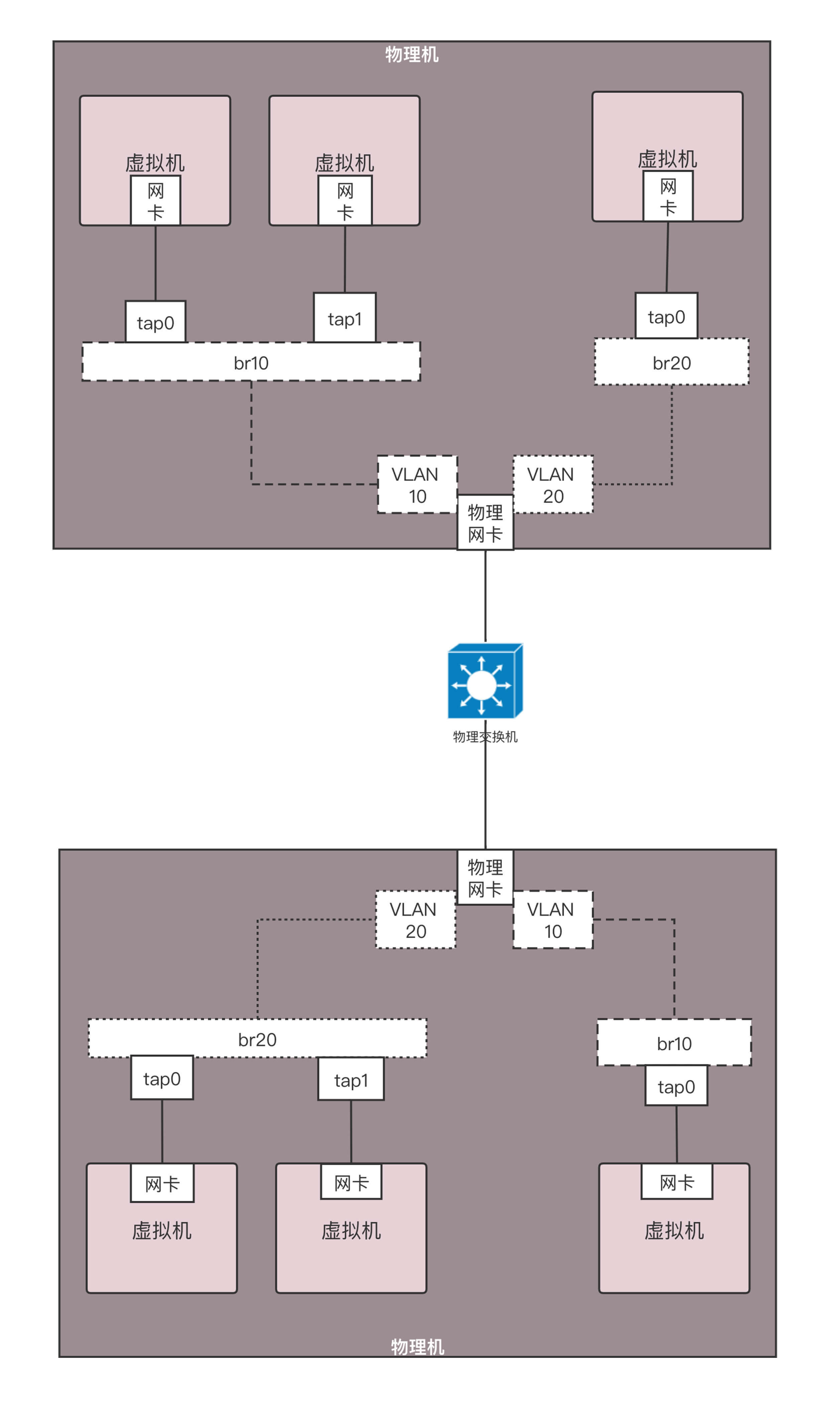 在数据中心里面,采取的也是类似的技术,只不过都是Linux,在每台机器上都创建网桥br0,虚拟机的网卡都连到br0上,物理网卡也连到br0上,所有的br0都通过物理网卡出来连接到物理交换机上。