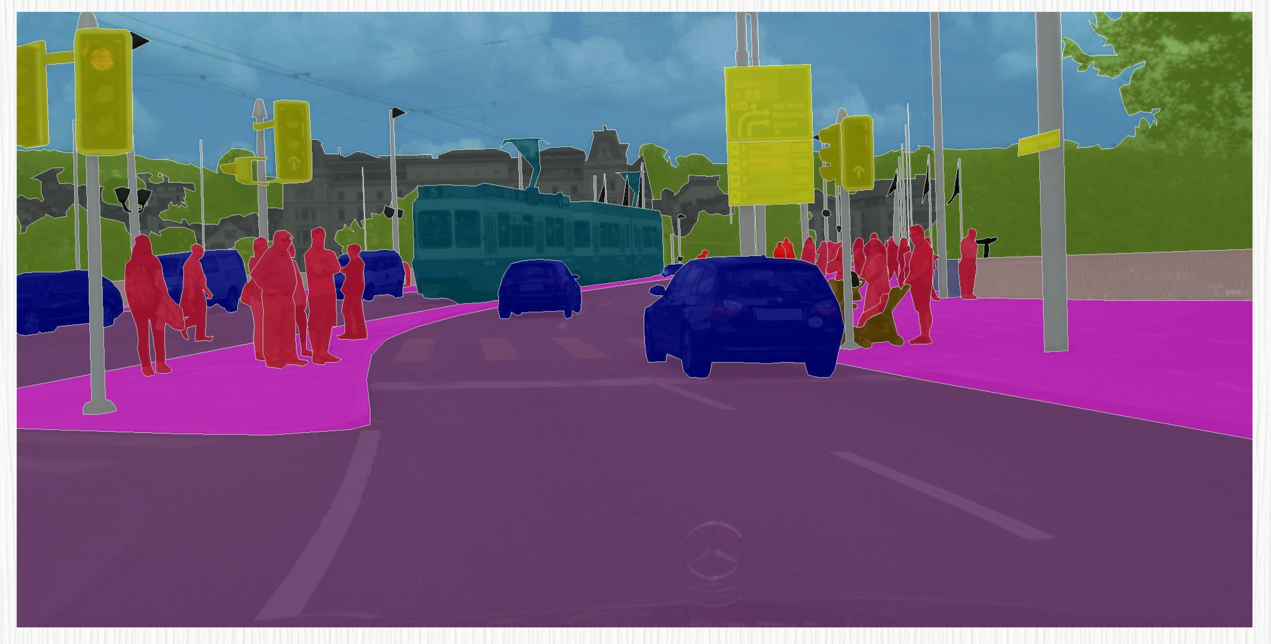 图像分割是计算机视觉领域的一种基本任务,它的目标是将图像划分为多个区域,对应于原图中不同的语义内容。比如下面这个例子,就是针对自动驾驶场景的图像分割效果。