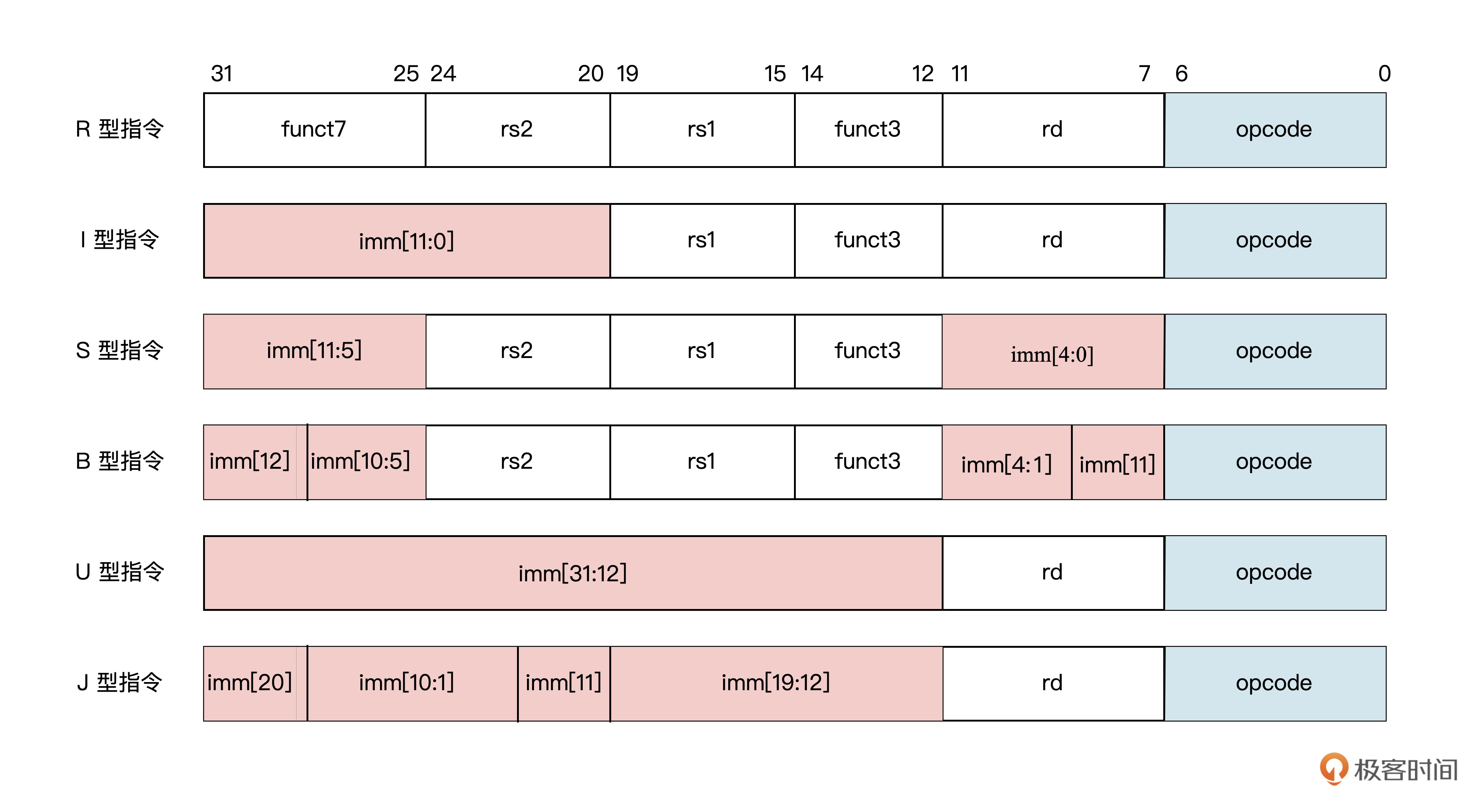 我们先从RV32I的指令格式说起。从下图可以看到,RISCV总共也就只有6种指令格式。