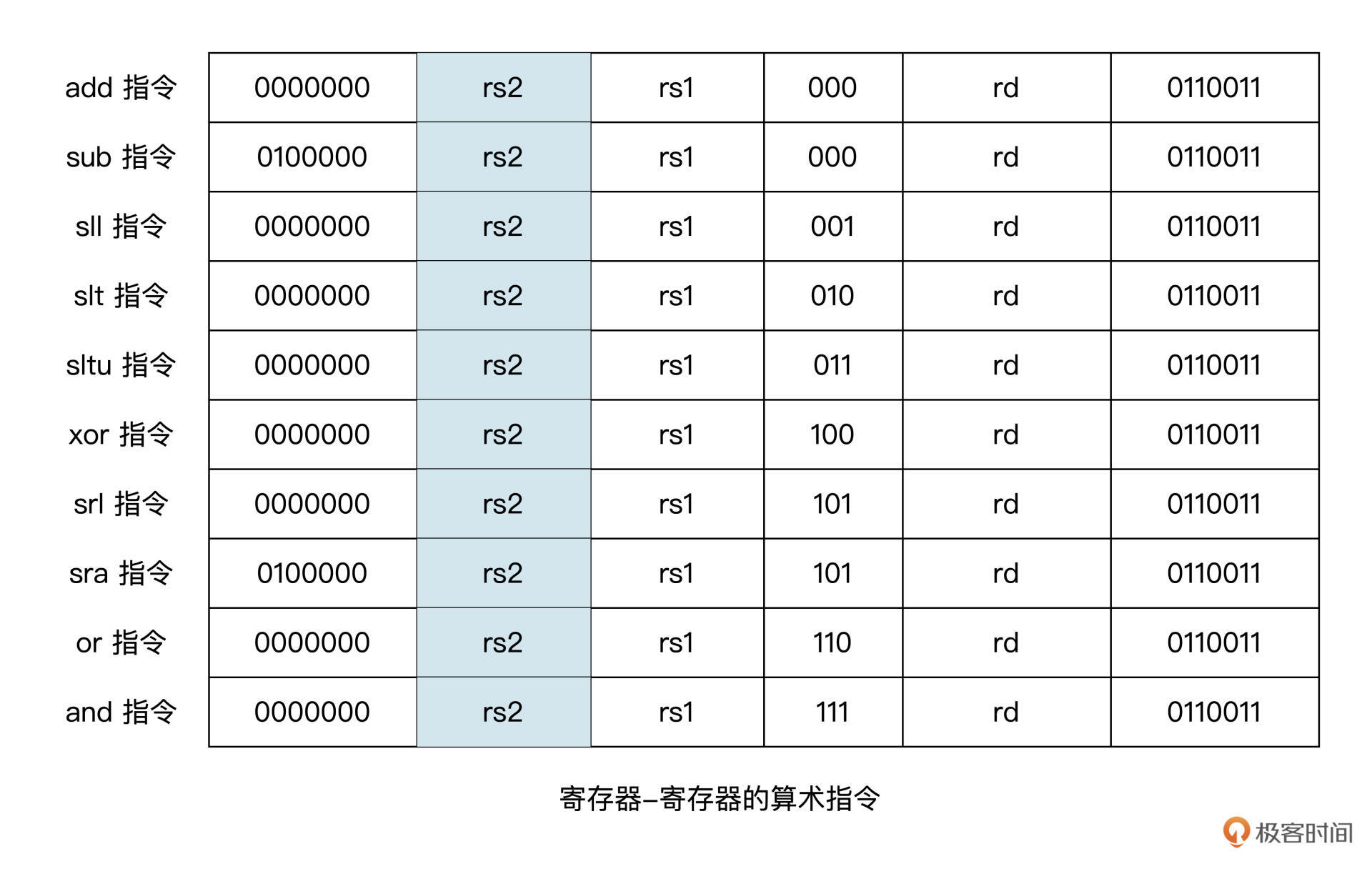 同样的,RV32I也提供了寄存器和寄存器操作的指令,包括加减运算、数值比较、逻辑操作和移位操作。这些指令的功能和前面的立即数指令相似,不同的是,这里把指令中的立即数对应位置替换成了源寄存器 rs2。
