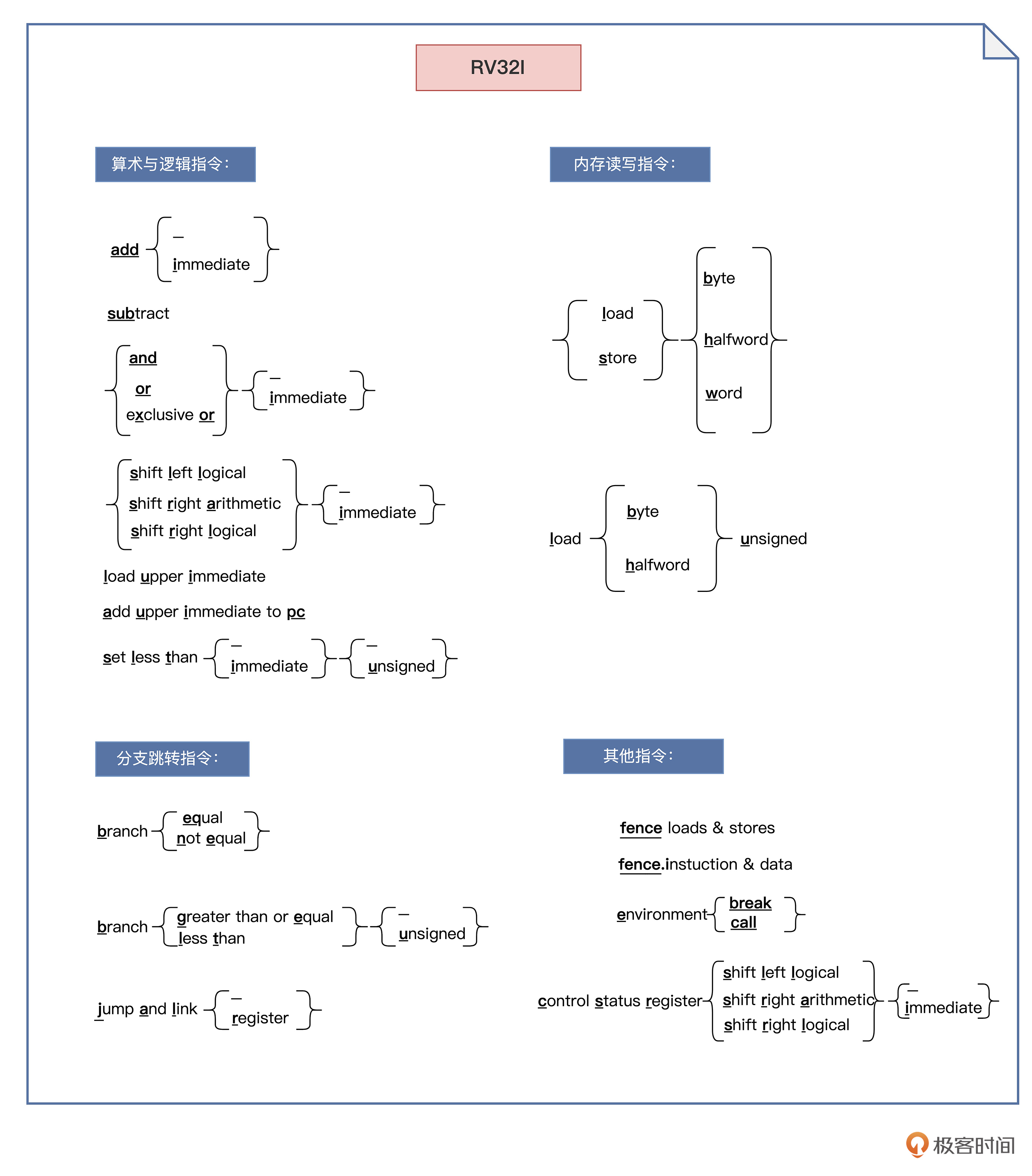 从图中我们可以看到,有些字母带有下划线。我们把带有下划线的字母从左到右连接起来,就可以组成一个 RV32I 的指令。对于每一个指令名称,集合标志{}内列举了指令的所有变体,变体用加下划线的字母或下划线字符_表示。如果大括号内只有下划线字符_,则表示对于此指令变体不需用字母表示。