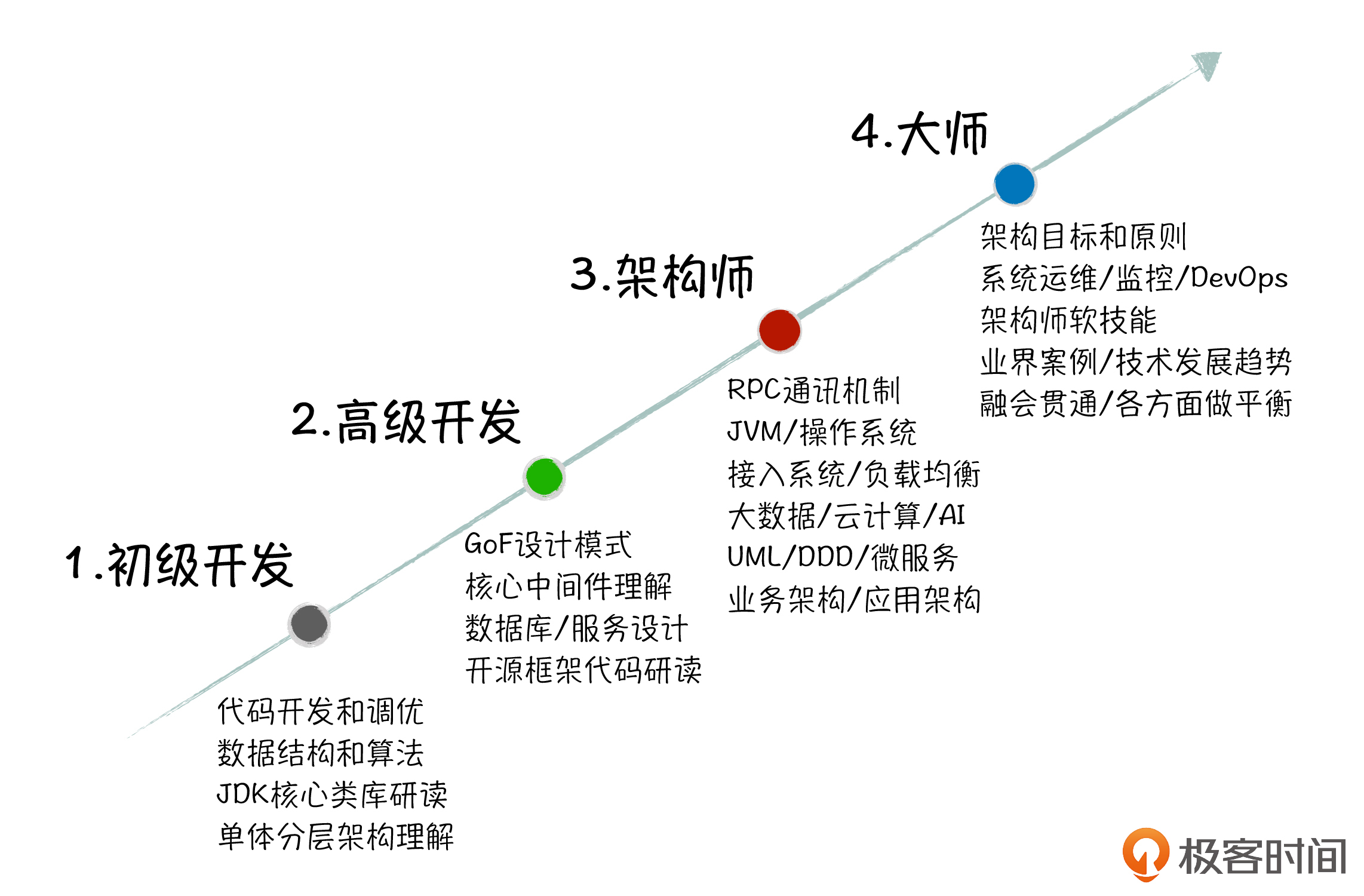 现在,你已经清楚了作为一个架构师,TA需要具备什么样的知识结构。如果你想成为一名架构师,在不同的成长阶段,你还需要学习不同的内容。这里,我以Java为例,进一步给出学习的重点内容,给你提供更具体的参考。