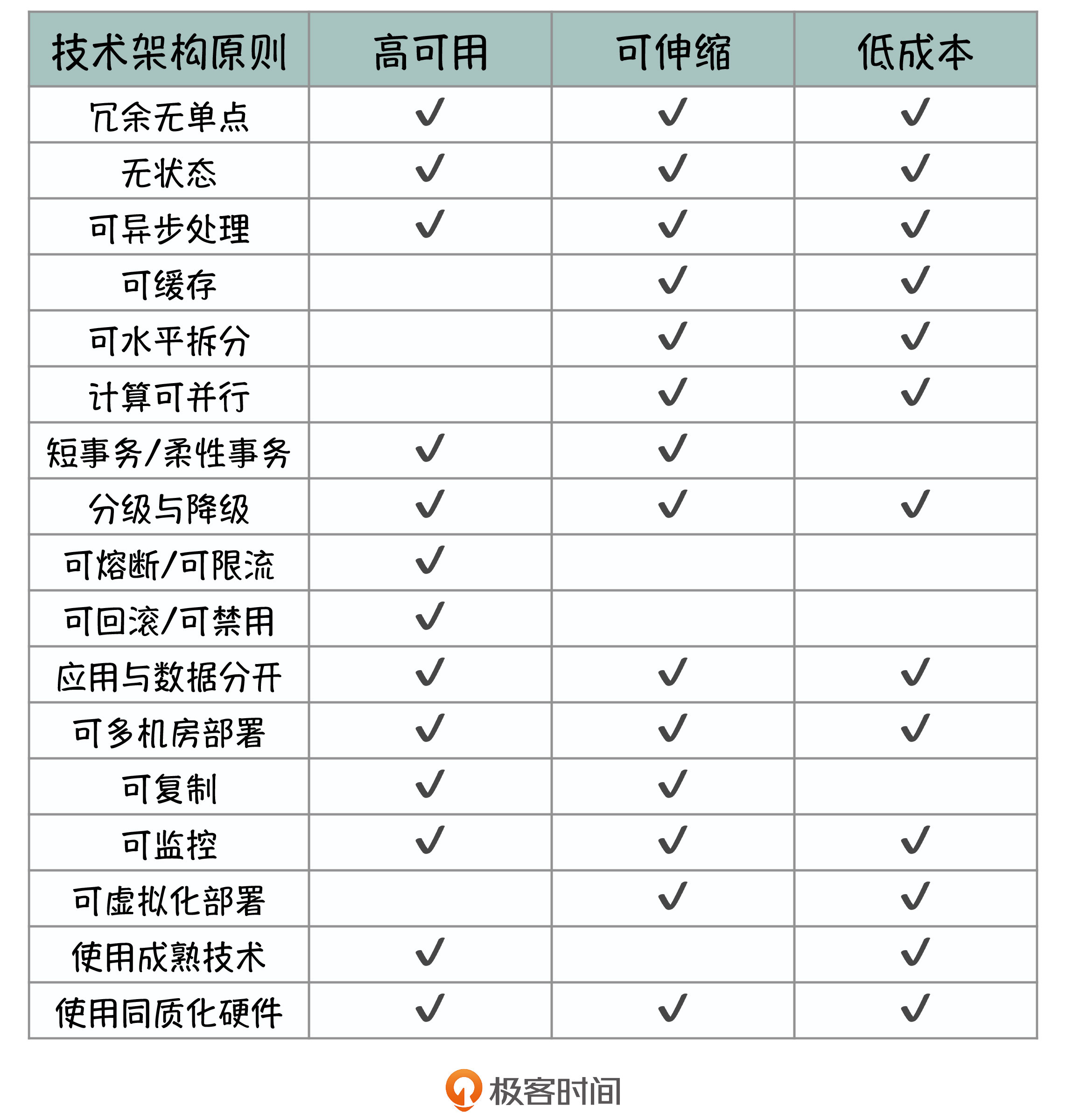 在技术架构篇,我针对系统的高可用、高性能、可伸缩和低成本,给你介绍了很多的架构设计原则,不同的原则对应着不同的目标,这里我把这些架构原则和目标汇总成一个表格,来帮助你更直观地了解它们。