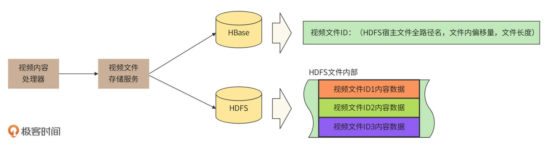HDFS适合存储大文件,大文件减少磁盘碎片,更有利于存储空间的利用,同时HDFS NameNode的访问压力也更小,所以我们需要把若干个视频文件合并成一个HDFS文件进行存储,并将存储相关的细节记录到HBase中。