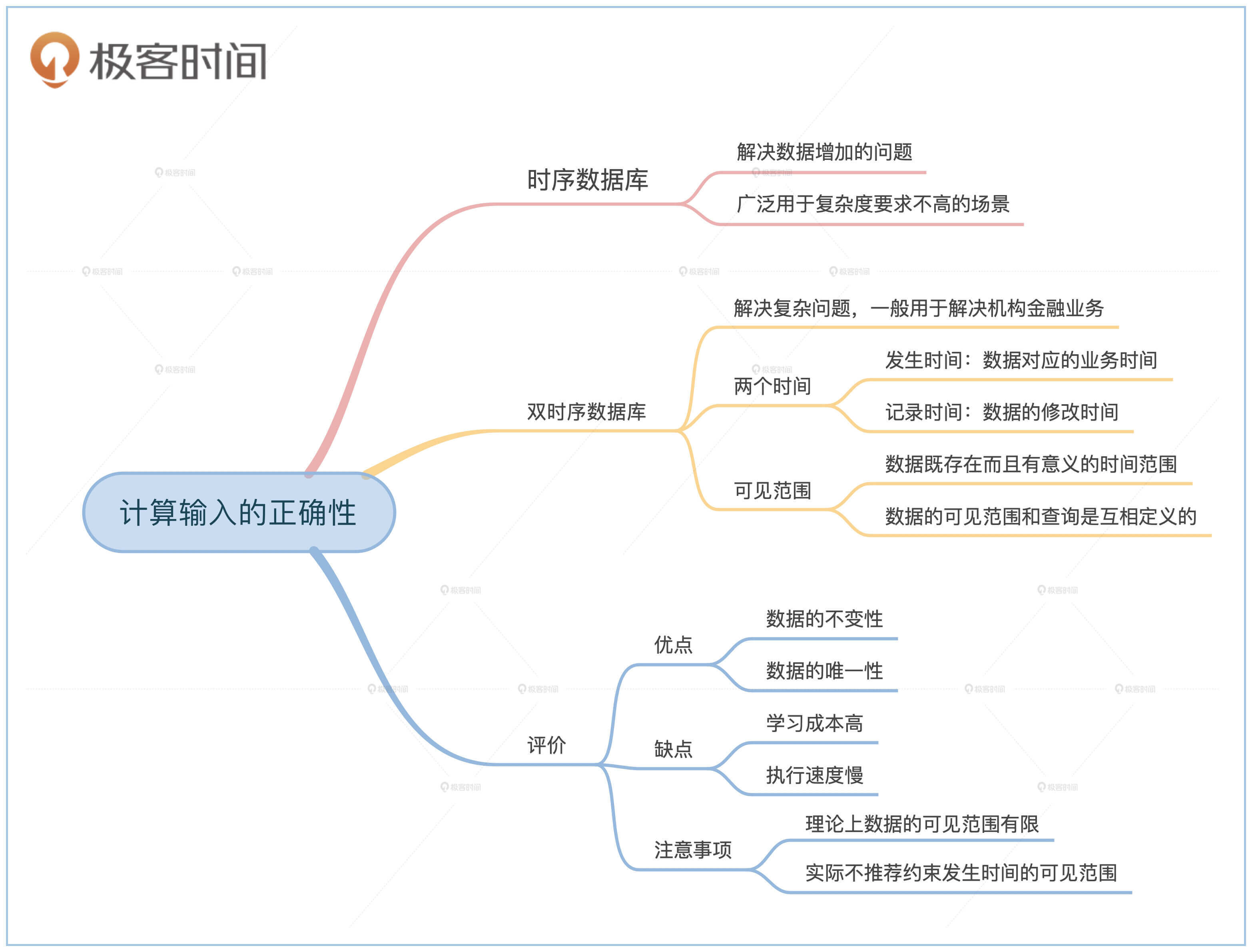 所以,**金融公司的数据正确性是一个正确性的管理问题。**你需要让业务、运营、财务、合规等所有部门的信息系统都用统一的数据访问方式。这种数据访问方式还需要可重现。不管是过了多少年,系统更新换代了多少次,开发人员换了多少批,你都能正确地知道过去发生了什么。这也是我们这节课叫作“正确时间”的原因。