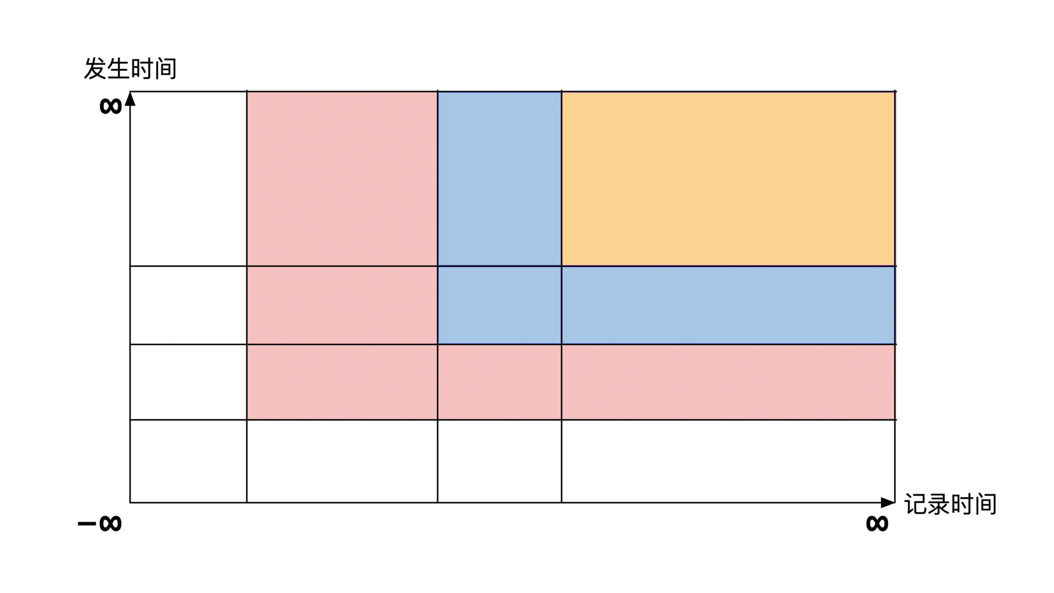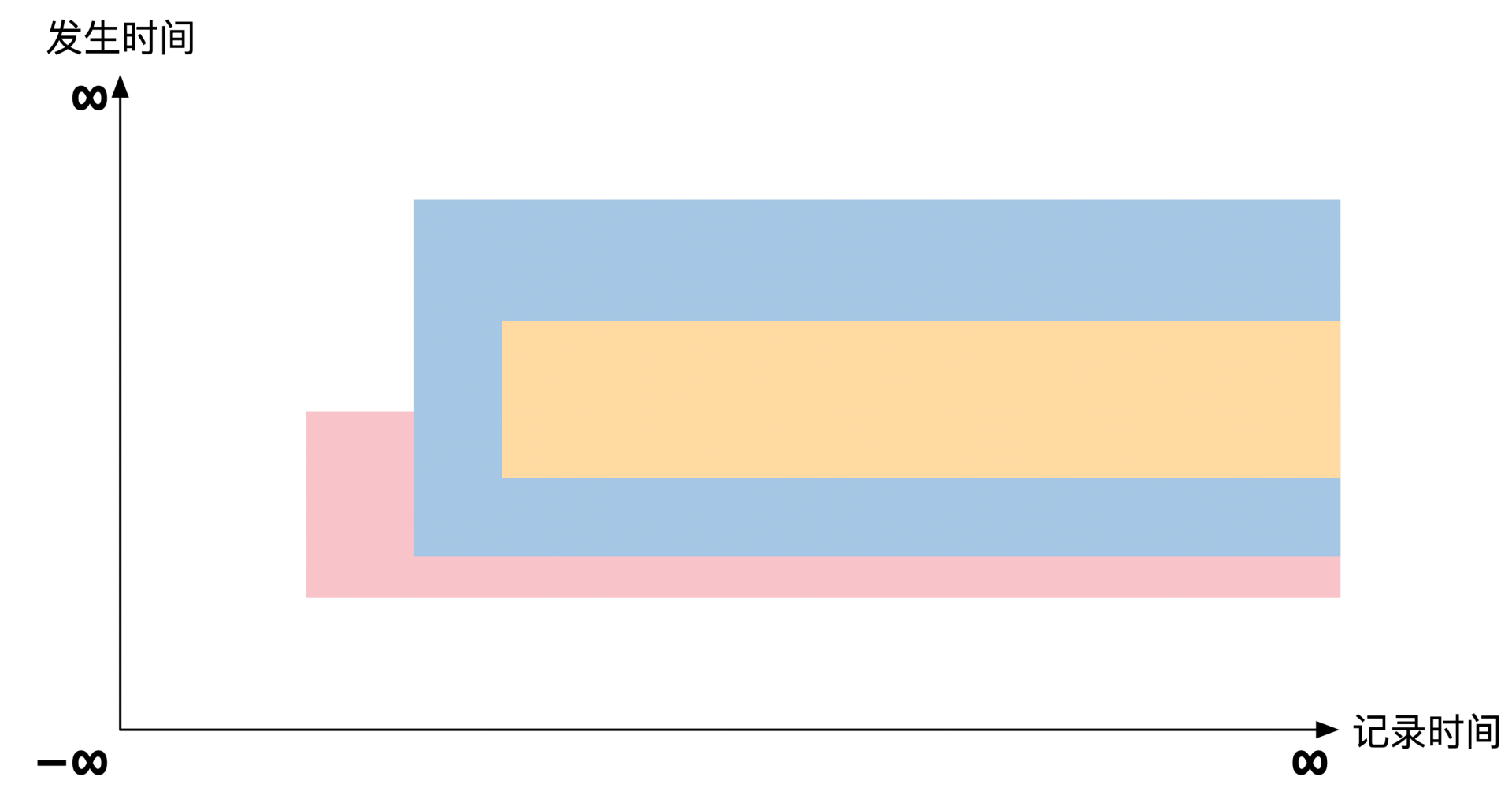 按照行业惯例,**横轴是记录时间,纵轴是发生时间。**理论上每个轴都指向正负无穷远,但是在实际展示中通常将坐标原点表示为负无穷远,主要是为了画起来好看。示意图如下: