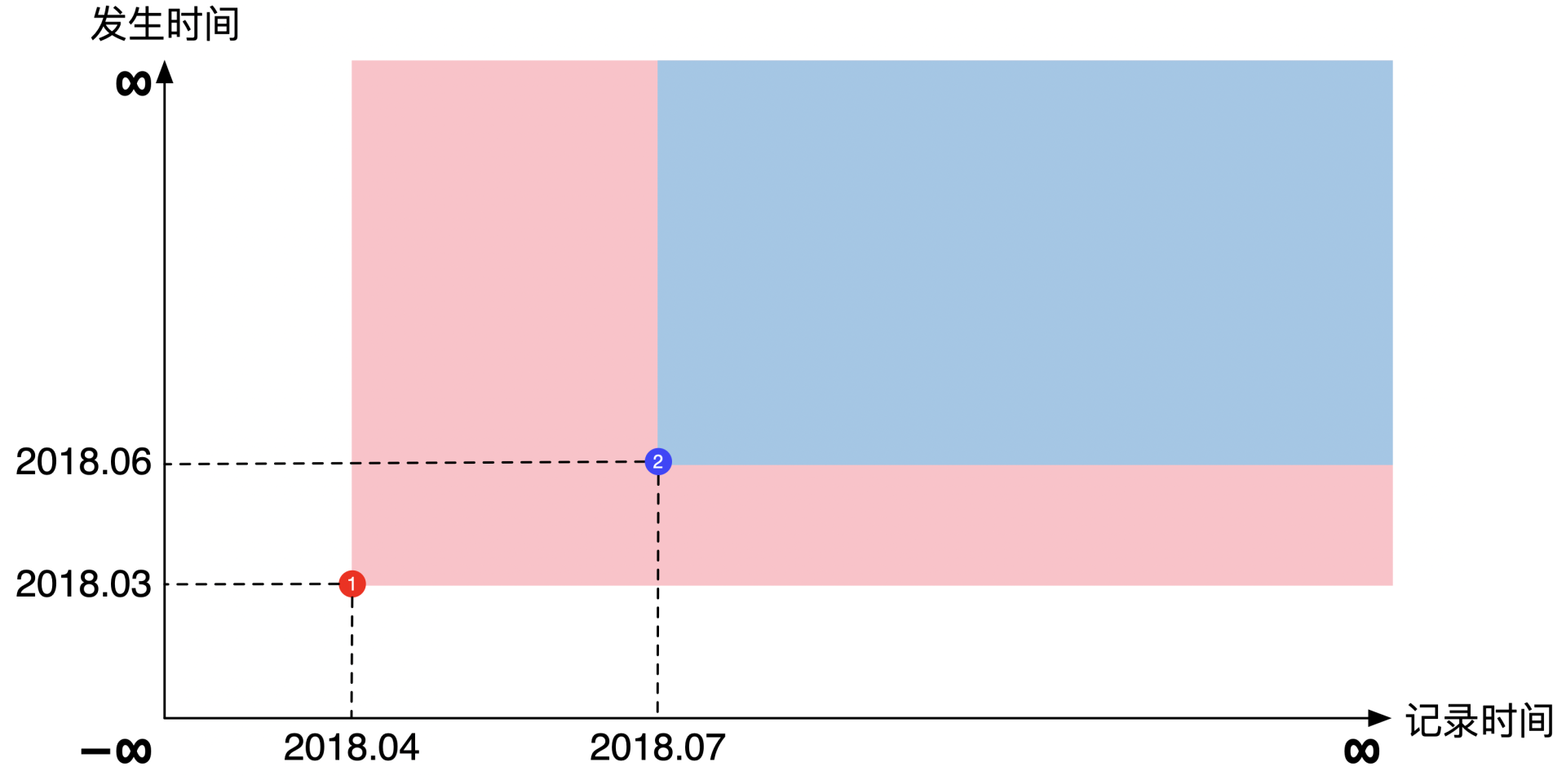 为了方便你理解核心概念,我把双时序数据库的时间逻辑画了出来。由于双时序数据库有两个时间,我们需要二维平面才能表示,所以我们需要画一个坐标系。