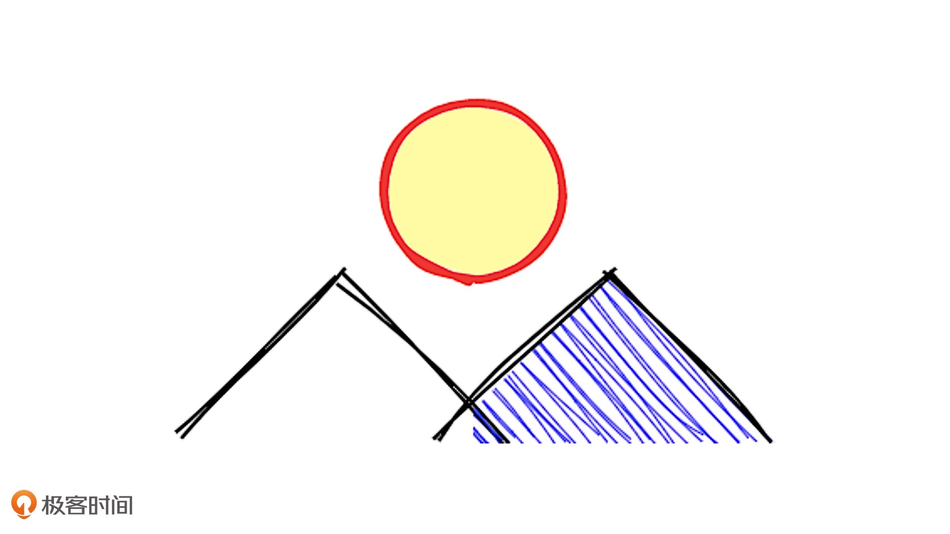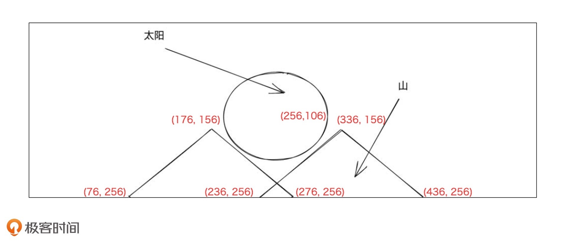 首先,因为Canvas坐标系默认的原点是左上角,底边的y坐标是256,而山的高度是100,所以山顶点的y坐标是256 - 100 = 156。而因为太阳的高度是150,所以太阳圆心的y坐标是256 - 150 = 106。