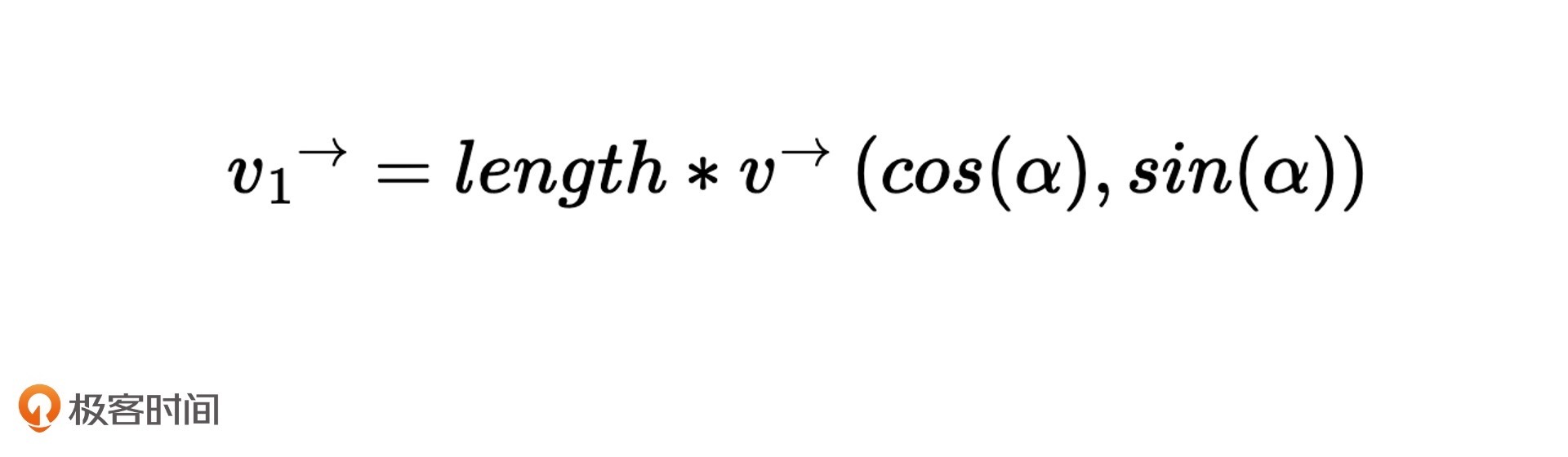 向量的旋转是向量的一种常见操作,对于二维空间来说,向量的旋转可以定义成如下方法(这里我们省略了数学推导过程,有兴趣的同学可以去看一下数学原理)。这个方法我们后面还会经常用到,你先记一下,后续我们讲到仿射变换的时候,会有更详细的解释。
