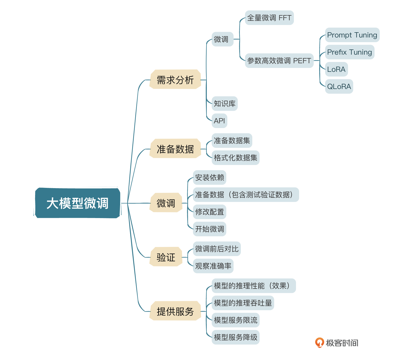 为了让你熟悉大模型微调整个操作流程,我通过一个法律小助手的案例,展示了需求分析、数据准备、微调训练、模型验证到提供服务的每一步操作,以及在实际操作中可能遇到的问题和解决方案。在这个过程中你还可以通过微调前后的问答对比,看到模型微调后的效果。