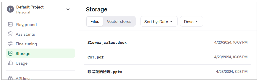 不过,如果我们不选择任何一个向量存储库(也就是Vector Stores)的ID,OpenAI也会把文件存储在Storage的Files中,而且会为这些文件自动创建一个向量存储库,如下图所示。