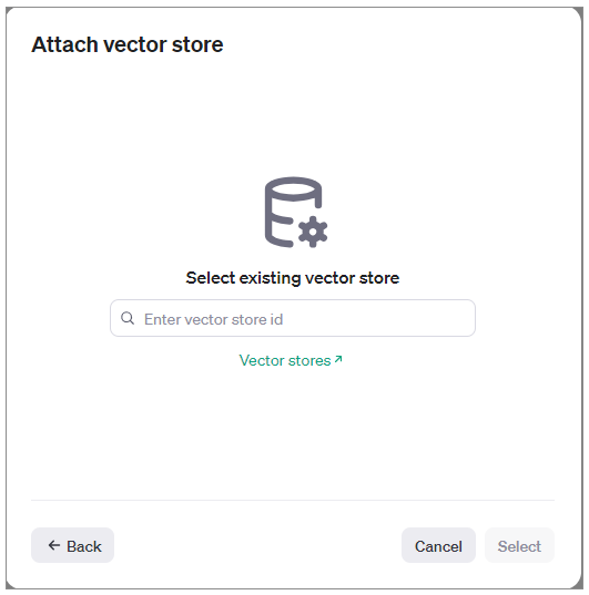 如果我们希望选择已经存在的向量存储库来管理文件,也可以,只需要在导入文件时选择Select vector store,并指定之前已经创建的向量存储库的ID。
