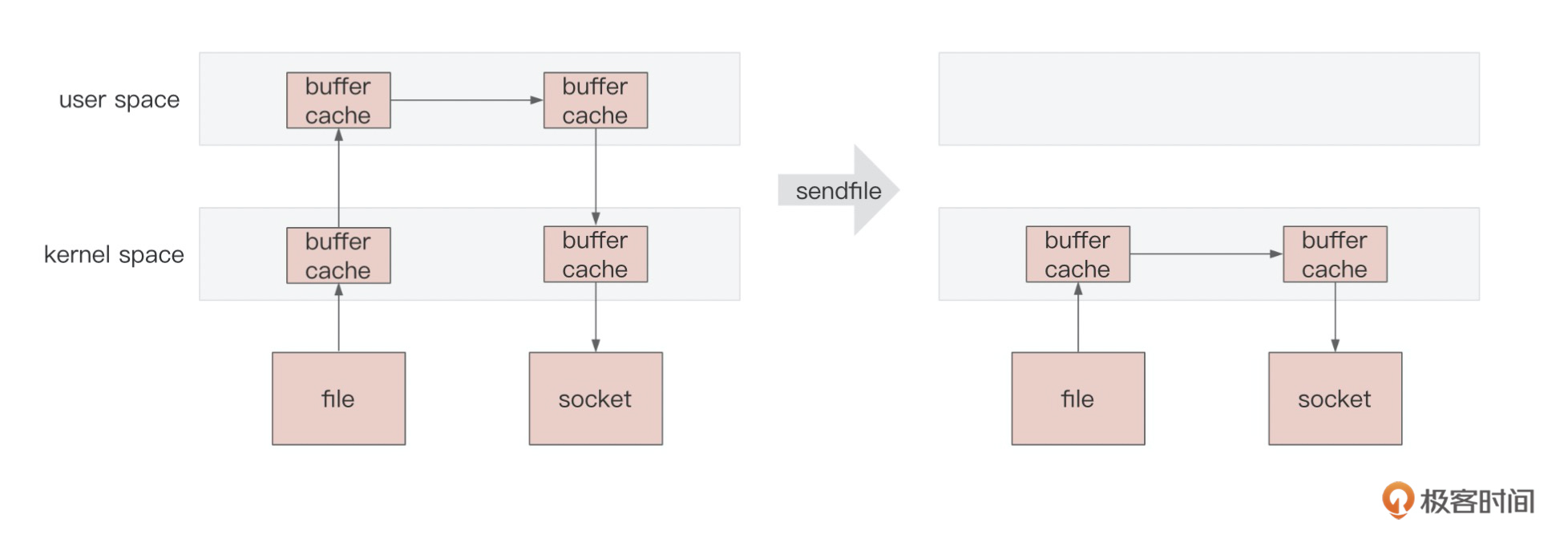 而sendfile的做法是省略掉了内核空间和用户空间的拷贝以及上下文切换操作,这也叫做零拷贝,节省资源的同时提高了效率,具体如下图所示: