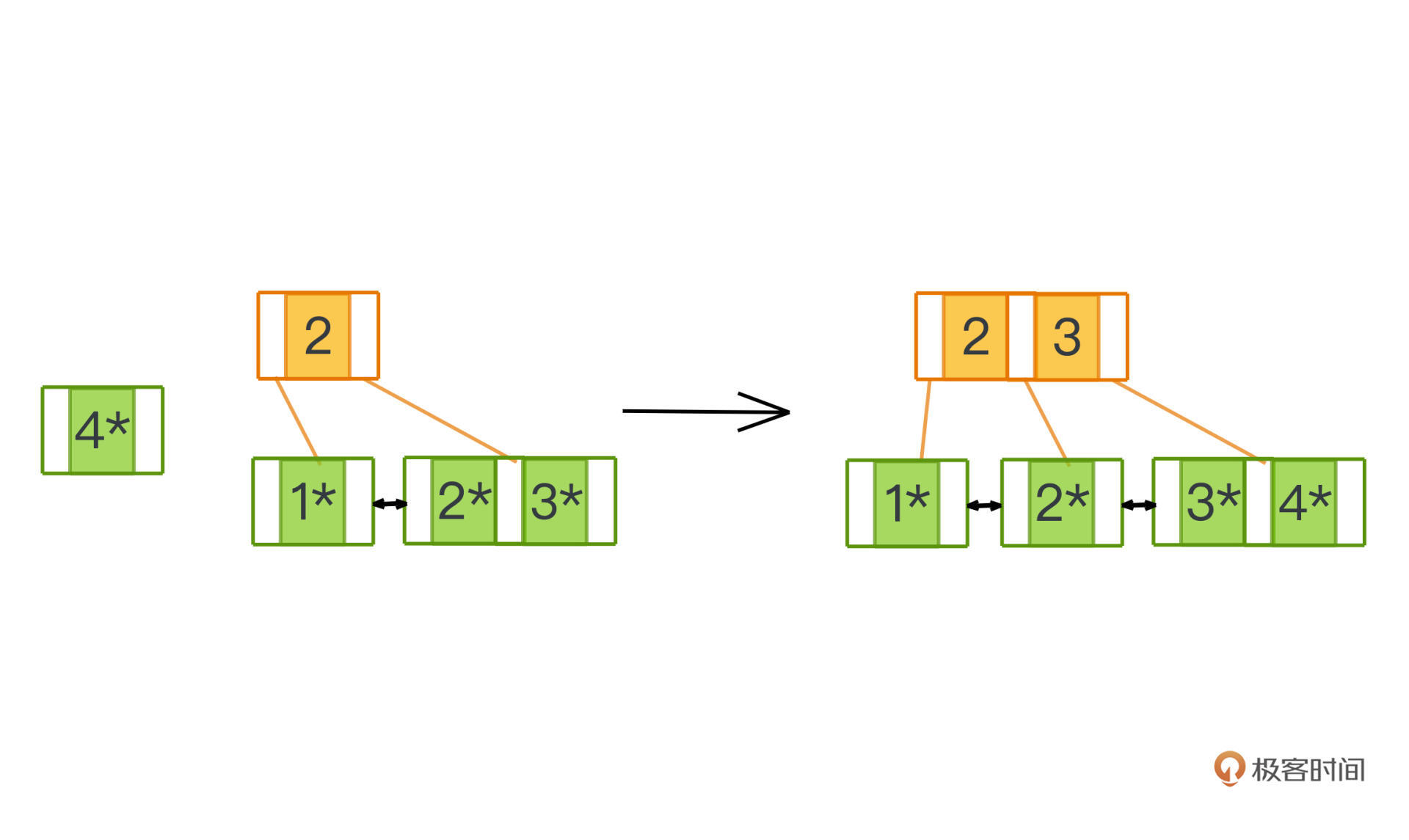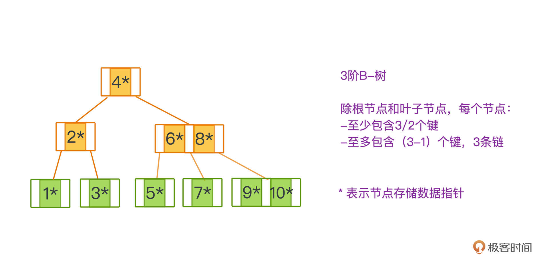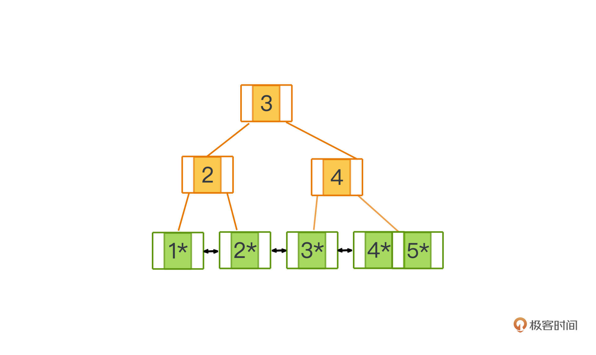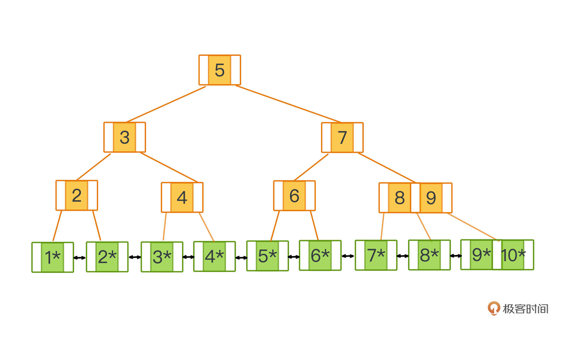 这个图就是一个典型的3阶B+树了。可以看到,红色的非叶子节点和绿色的叶子结点的键会有一定的重合,这就是因为非叶子结点不再存储实际的数据信息,所以叶子结点实际上需要存储整张表的信息,但因为树状结构的特性,两者的层数预期仍然都是logN。