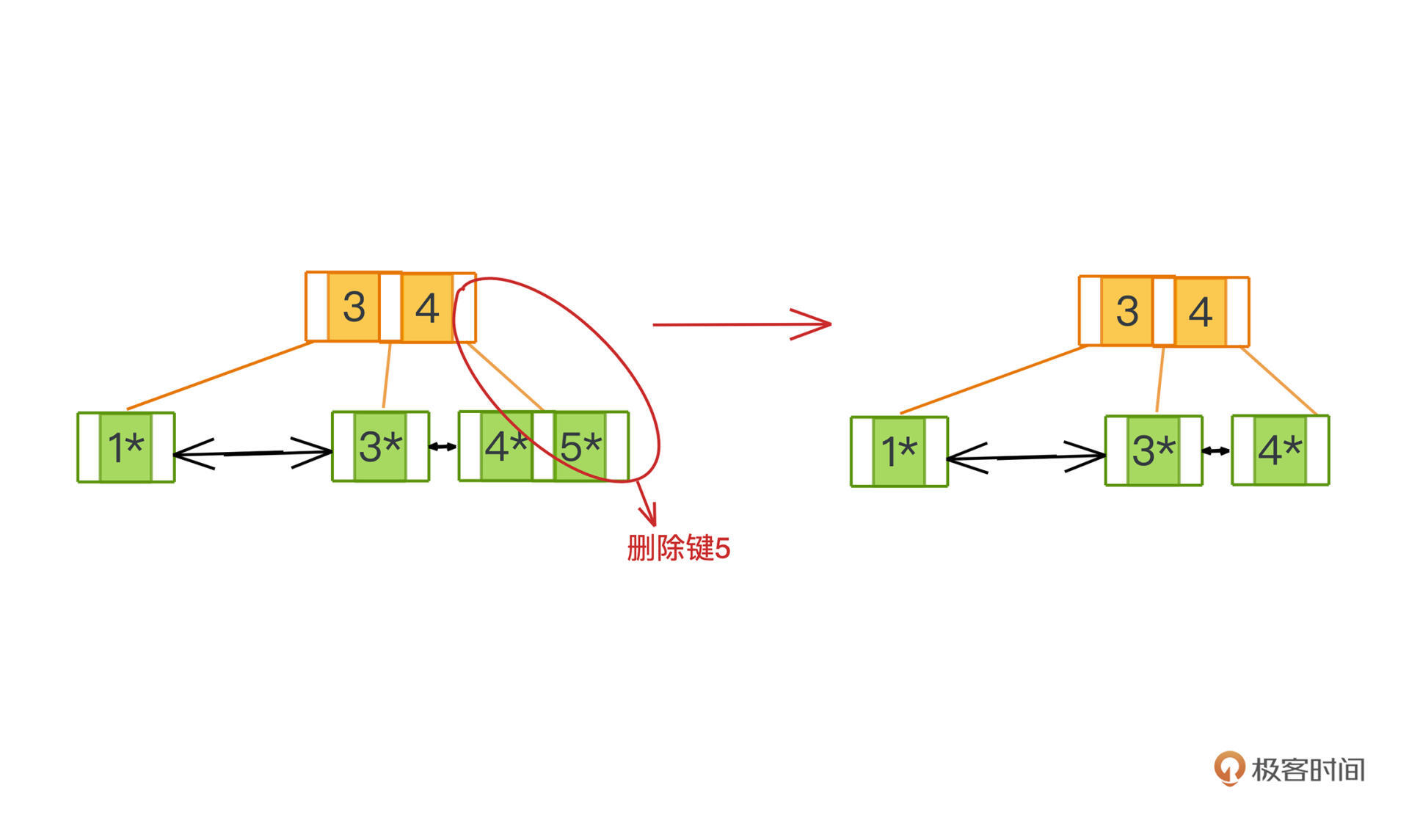 这样我们就可以重新得到一颗平衡的B+树了。每次让父节点下沉,也可能重新破坏父节点的约束条件,我们同样要递归地找左侧兄弟节点借用键或者考虑让更上层的父亲节点下沉,直到整颗树满足约束为止。
