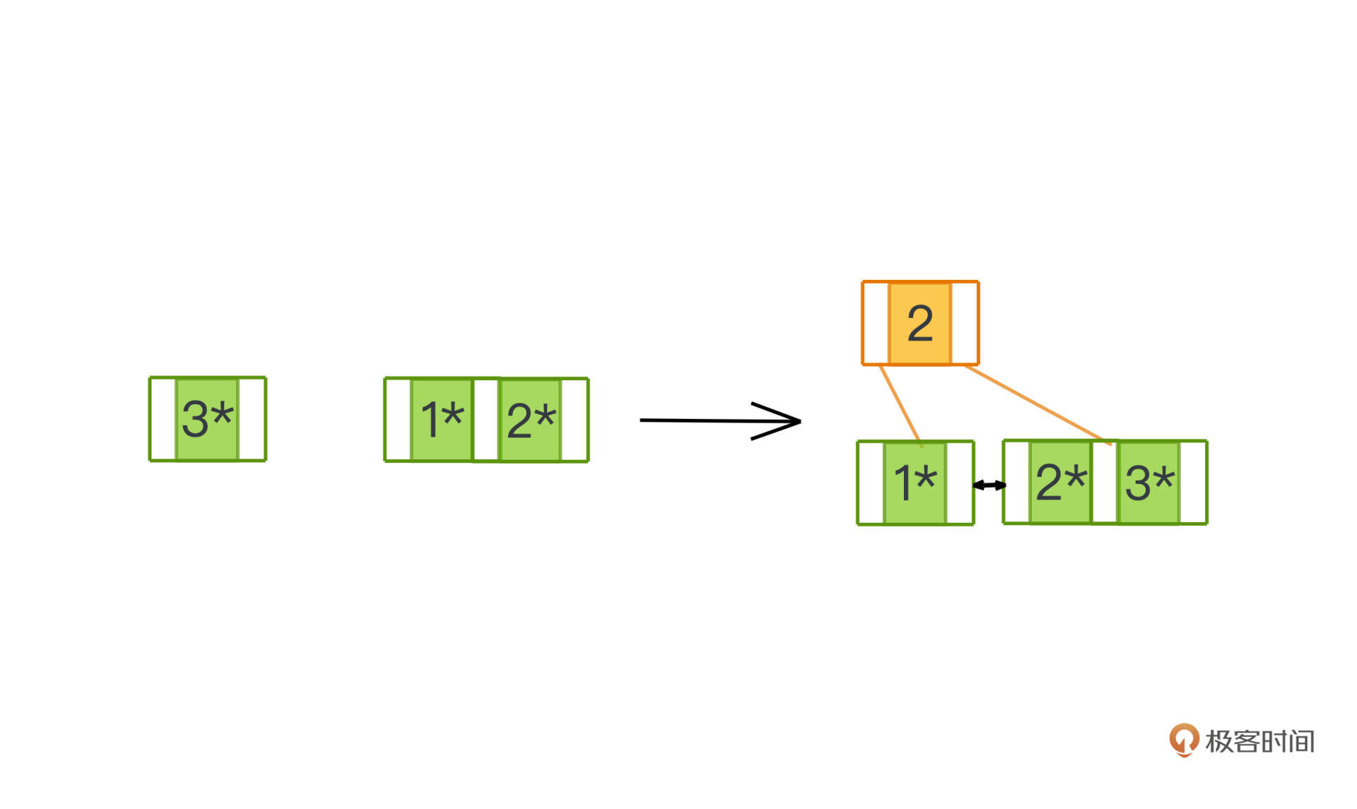 这里,对于3阶B+树而言,左子节点就分到一个键,右子节点则分到两个键。叶子节点间,我们同样需要用双链表的方式进行串联。