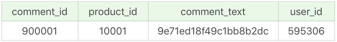 1 | mysql> SELECT comment_id, product_id, comment_text, user_id FROM product_comment WHERE comment_id = 900001; |