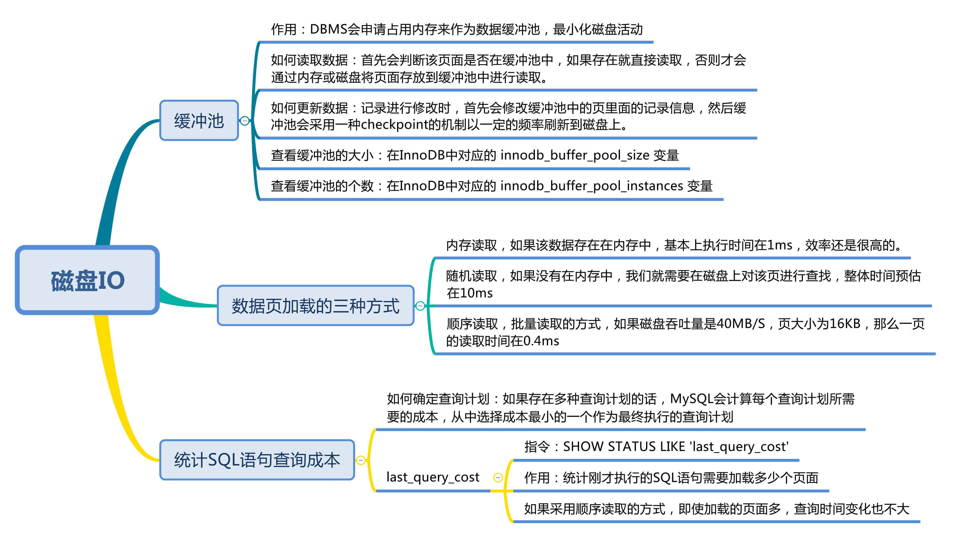 磁盘I/O需要消耗的时间很多,而在内存中进行操作,效率则会高很多,为了能让数据表或者索引中的数据随时被我们所用,DBMS会申请占用内存来作为数据缓冲池,这样做的好处是可以让磁盘活动最小化,从而减少与磁盘直接进行I/O的时间。要知道,这种策略对提升SQL语句的查询性能来说至关重要。如果索引的数据在缓冲池里,那么访问的成本就会降低很多。