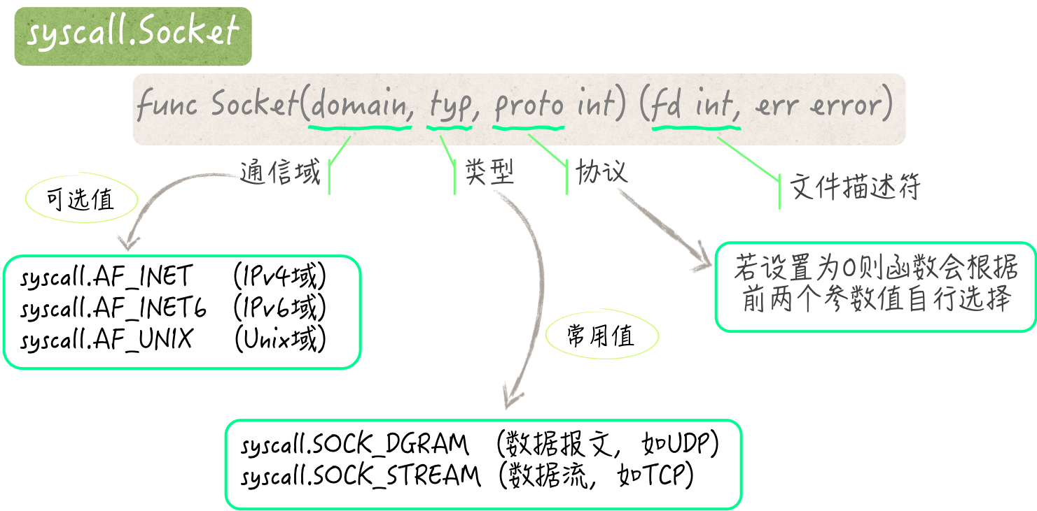 为了更好地理解这些可选值的深层含义,我们需要了解一下syscall.Socket函数接受的那三个参数。