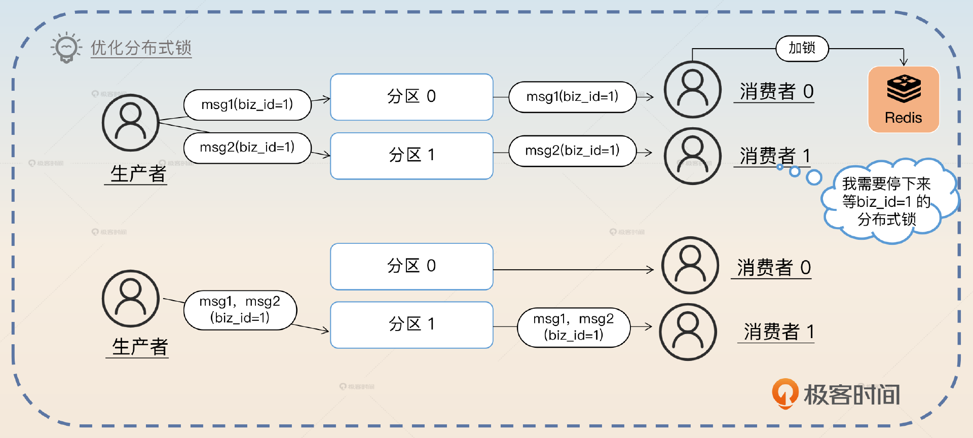 但是,实际上我们可以通过主动选择目标分区使相同的业务总是把消息发到同一个分区上,确保同一时间只有一个消费者处理一个业务的消息,这样就可以把分布式锁去掉。它带来的好处就是,当没有分布式锁的时候,也不会有消费者因为等待分布式锁而导致消费速率下降了。