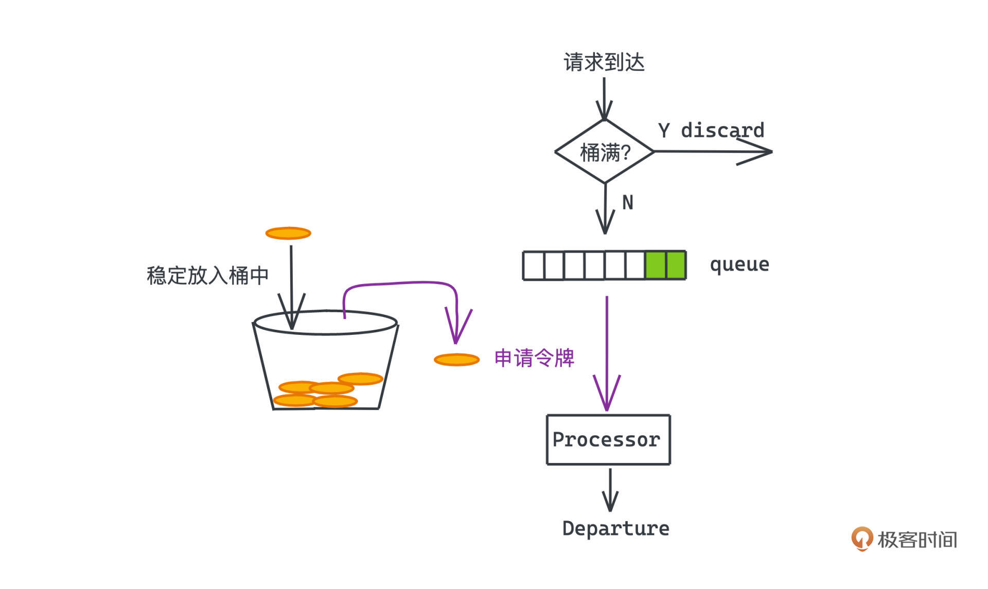 我们用一个FIFO队列模拟水桶,队列的容量就是水桶的最大大小。每来一个请求,就存储到队列中,如果队列满了,就直接拒绝。而另一侧,我们会有一个线程稳定消费队列中的数据,这样,整个系统不管在请求流量多么不稳定的情况下,都可以维持一个非常稳定的流量处理速度。思路非常清晰也很简单,你可以试着实现一下具体的逻辑。