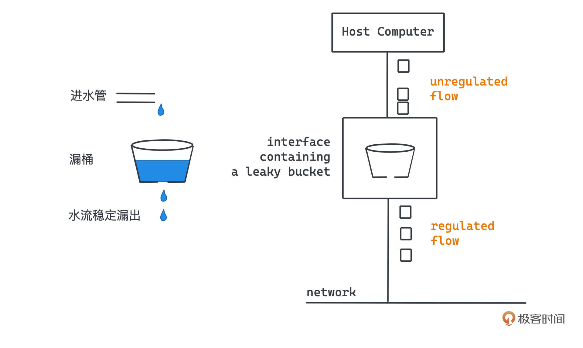 漏桶也就是leaky bucket,名字非常直观,本质就是用计算机模拟一个有漏洞的水桶,只要漏桶中有水存在,水桶的漏洞处就会稳定的有水流漏出。