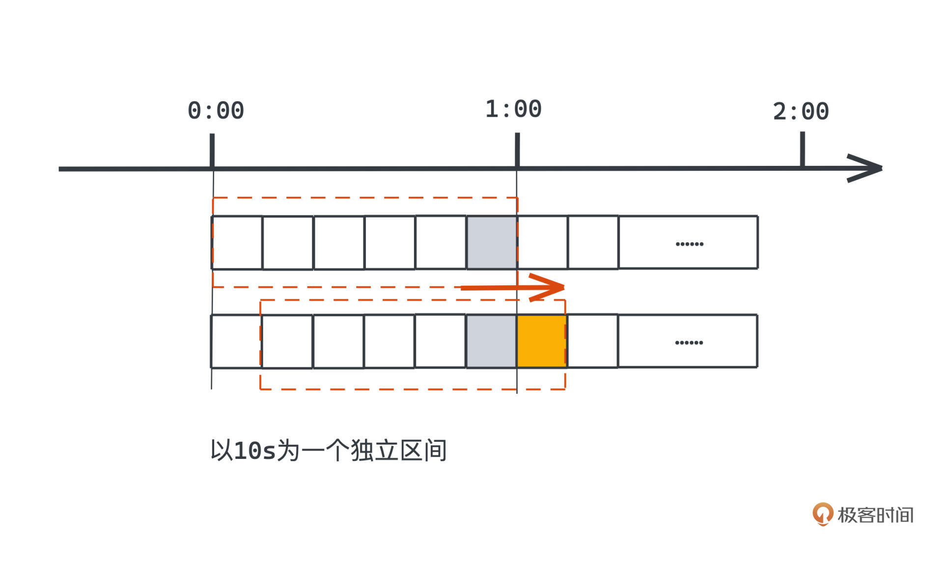 很简单,我们遍历过去一分钟内每个独立区间,也就是每10秒内的计数器的计数总和,这个总和当然就是过去一分钟内全部的请求数量了。当然每次经过10s,我们也自然需要把整个计数区间往右边移动一格。在图中的体现就是,当时间经过1:00的时候,整个限流器的计数器范围就去掉了最左边0:00-0:10的区间,增加了橙色的格子,也就是1:00-1:10的区间,这样的过程也就是我们通常所说的“滑动窗口”了。