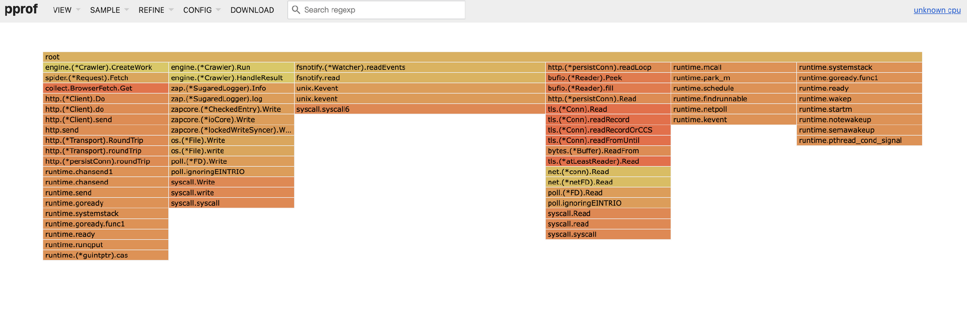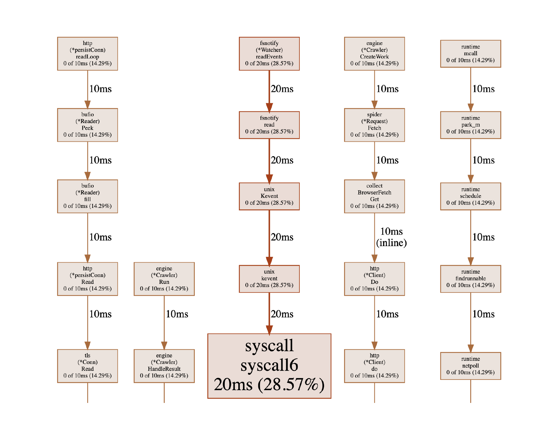 从图片中我们可以看出耗时最多的函数在哪里。例如,从第一列调用链可以看出,在我们探测的周期内,程序有14.29%的时间是在http.readLoop函数中工作,这个函数是http标准库中读取数据的协程。从整体上可以看出,我们的耗时主要是在网络数据处理上。用户协程的数据处理占用的CPU极少。