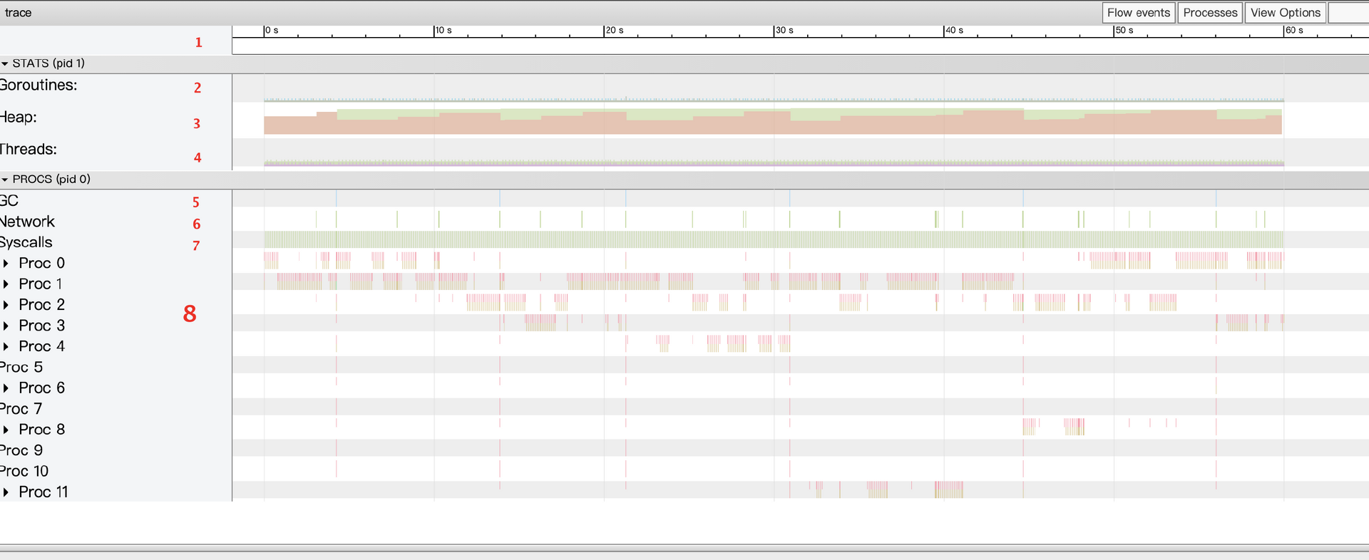 而 trace 是以事件为基础的信息追踪工具,它可以反映出一段时间内程序的变化,例如频繁的 GC 和协程调度情况等,方便我们追踪程序的运行状态,分析程序遇到的瓶颈问题。